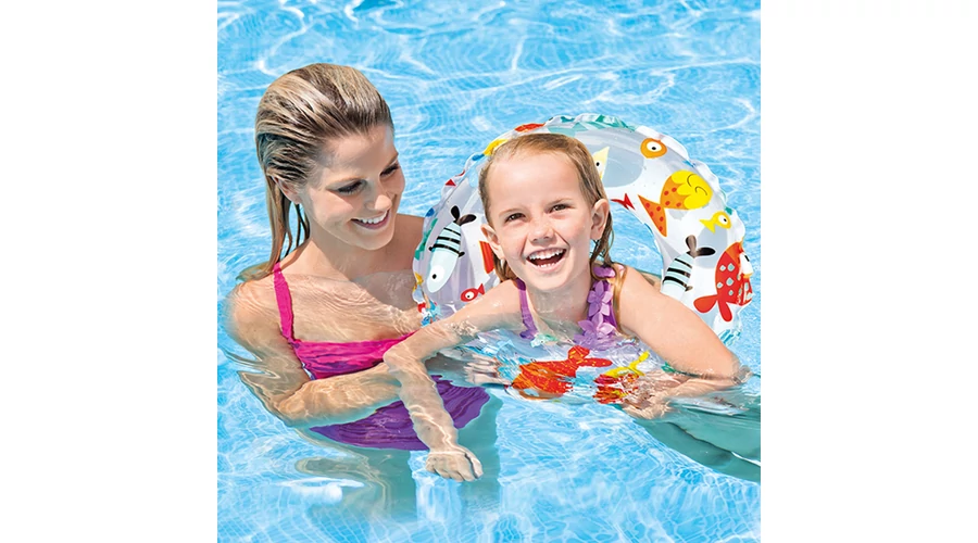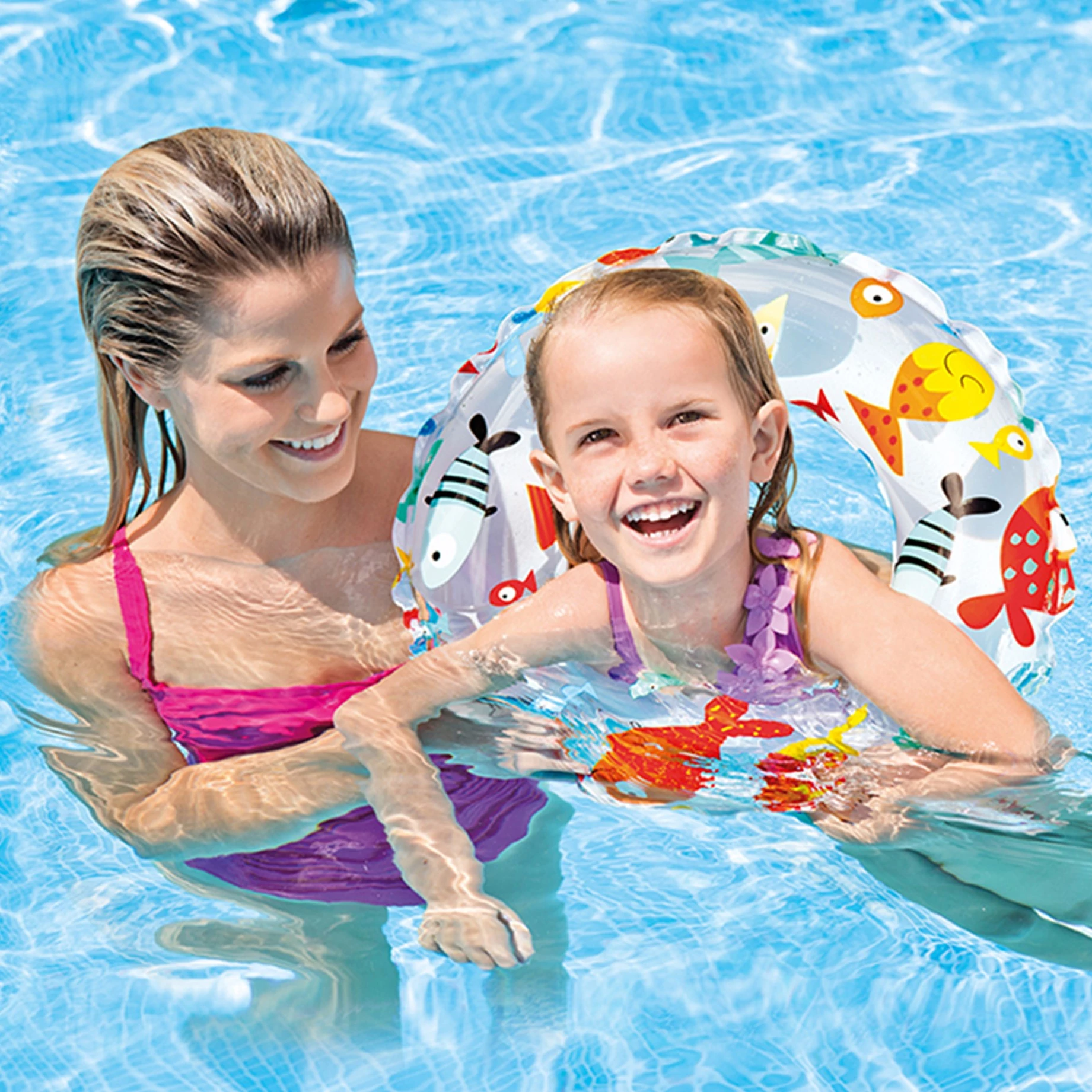 Надуваем пояс за плуване с предпазен клапан, наличен в четири различни десена, които се изпращат на случаен принцип. Външен диаметър: 61 см. Цената е за 1 бр.! Препоръчва се за деца на 6-10 години! Внимание: използването му от деца се препоръчва само в плитка вода и под надзора на възрастен!