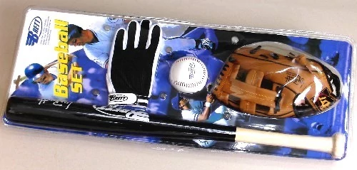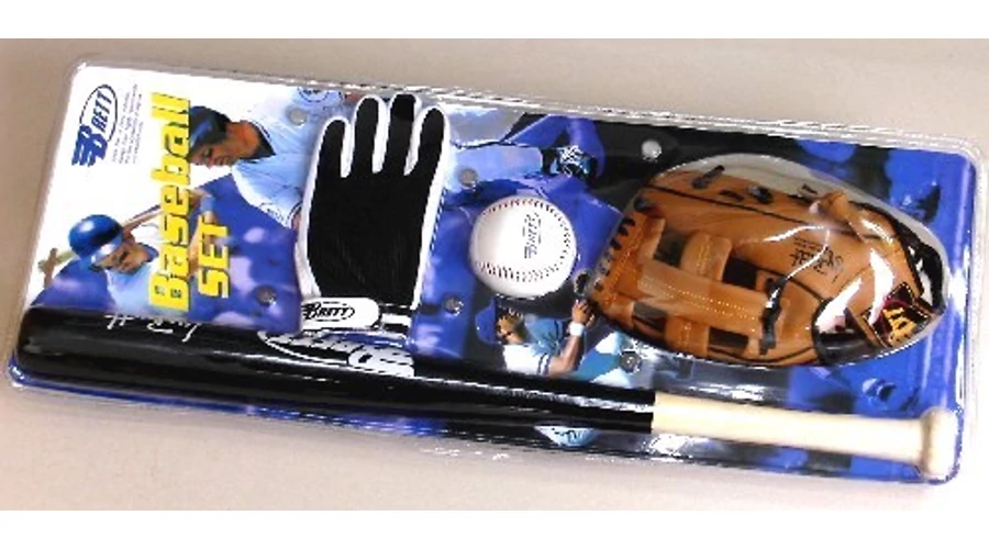 Съдържание на комплекта: 1 бр. бейзболна бухалка с дължина около 60 см (черна), 1 бр. синтетична ръкавица за ловене в юношески размер, 1 бр. ръкавица за хвърляне, 1 бр. бейзболна топка.