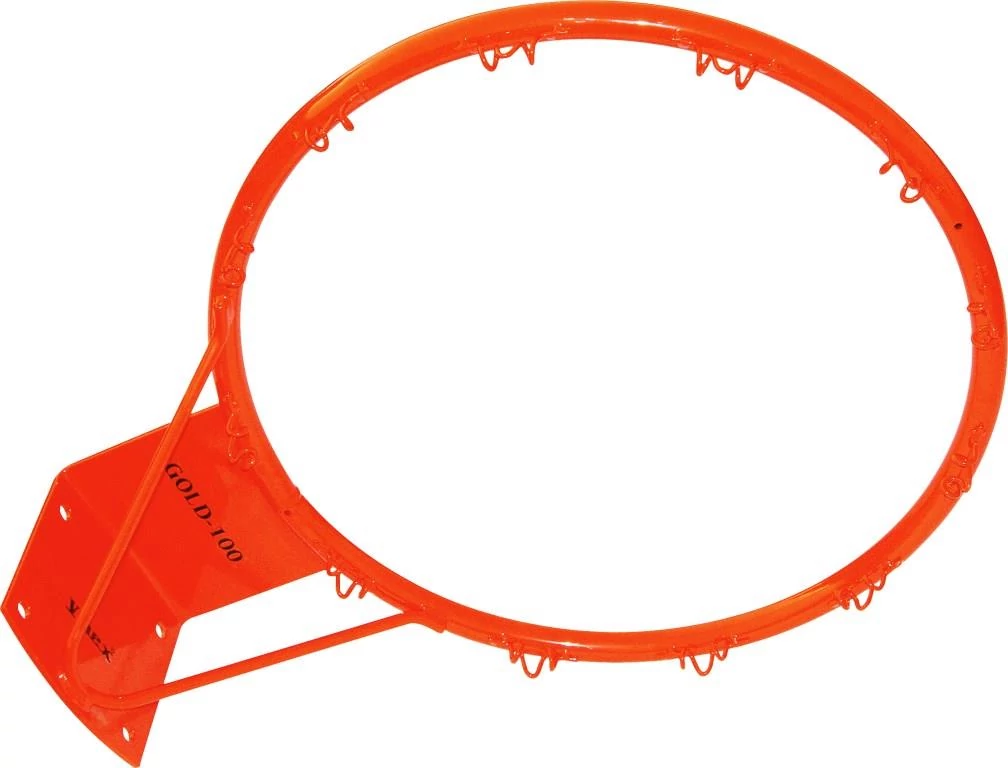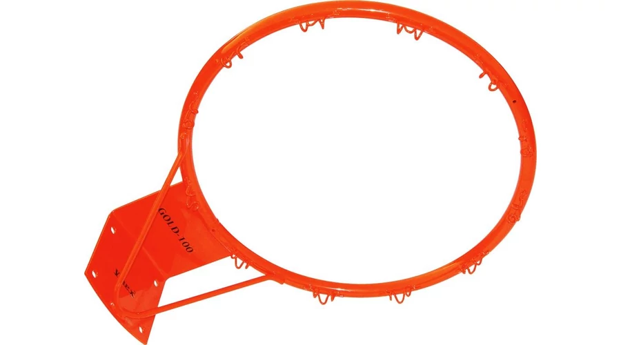Масивен, прахово боядисан метален баскетболен ринг с дебелина на тръбата 22 mm, за баскетболна топка размер 7, с метални подпори 13 mm, със заден панел. С текстилна мрежа и монтажни болтове. Хоризонтално разстояние между отворите: 11 cm, вертикално разстояние между отворите: 9 cm.