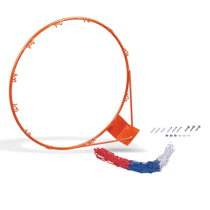 Метален баскетболен ринг, 9 mm, за баскетболна топка размер 7, с 6 mm метални подпори, с табло. С 12 бр. възможности за закрепване на мрежата с куки. С мрежа и винтове.