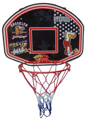Баскетболно табло (материал: пресована дървесна плоскост с дебелина 10 мм) с метален ринг и мрежа. Размер: 60×45 см. Рингът е сгъваем, диаметър: 32 см. Таблото е препоръчително за домашна стая / покрита употреба на открито, за използване с леки топки (100–150 грама). Други аксесоари: мини гумена топка, баскетболна мрежа, ръчна помпа с иглен вентил. Тегло: 2,8 кг.