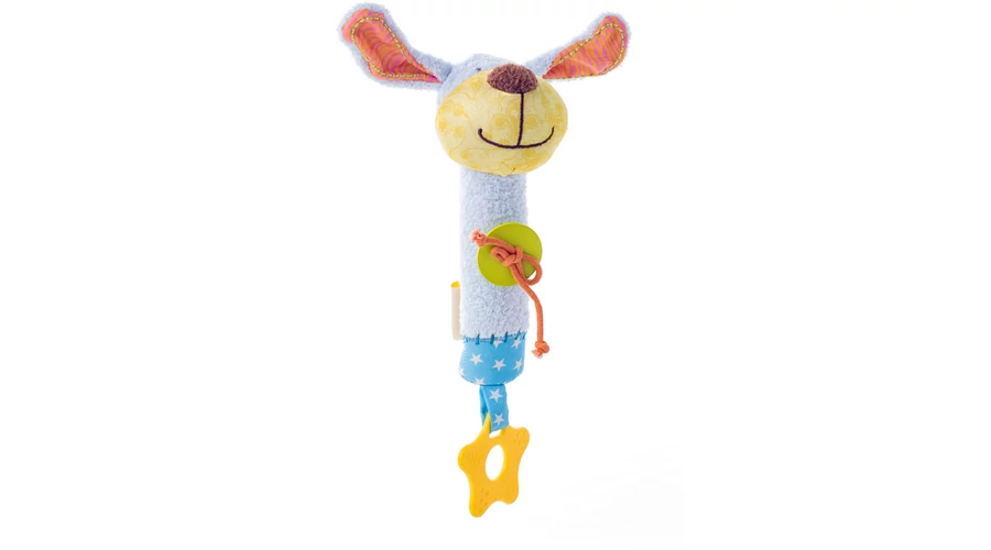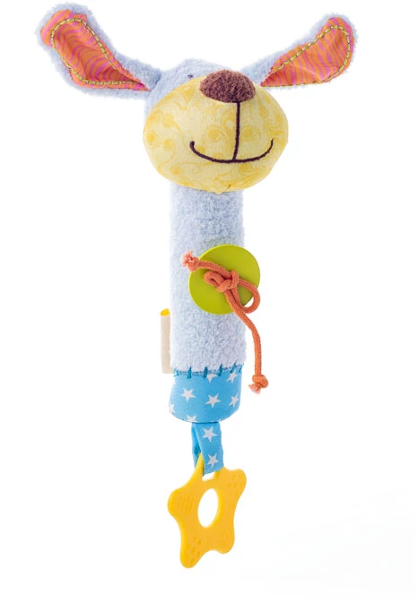 Мека бебешка играчка със свирещ звук. При натискане на коремчето сладкото кученце изсвирва, а отдолу е прикрепена гризалка. Дължина (с гризалката): 23 см. Подходяща още от новородено!