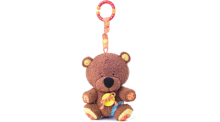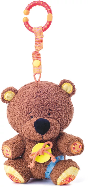Това сладко мече може да се закача на бебешко креватче, количка, кошница за носене, въртележка за креватче и още на хиляди места. Дрънчи, шумоли, може да се гризе, да се гушка и забавлява бебето във всяка ситуация. Размер: 20×14 см. Подходящо още от новородено!