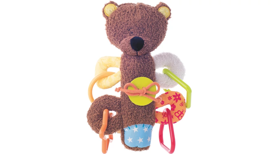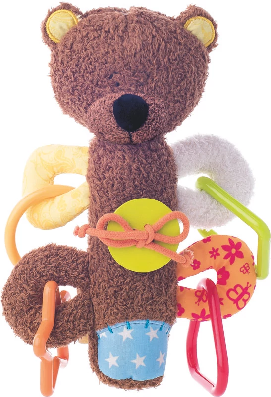 Мека бебешка играчка, която издава пискащ звук. Като натиснете коремчето на сладкото мече, то писка; към него са прикрепени 4 бр. гризалки. Дължина: 18 см. Подходяща още от новородено!