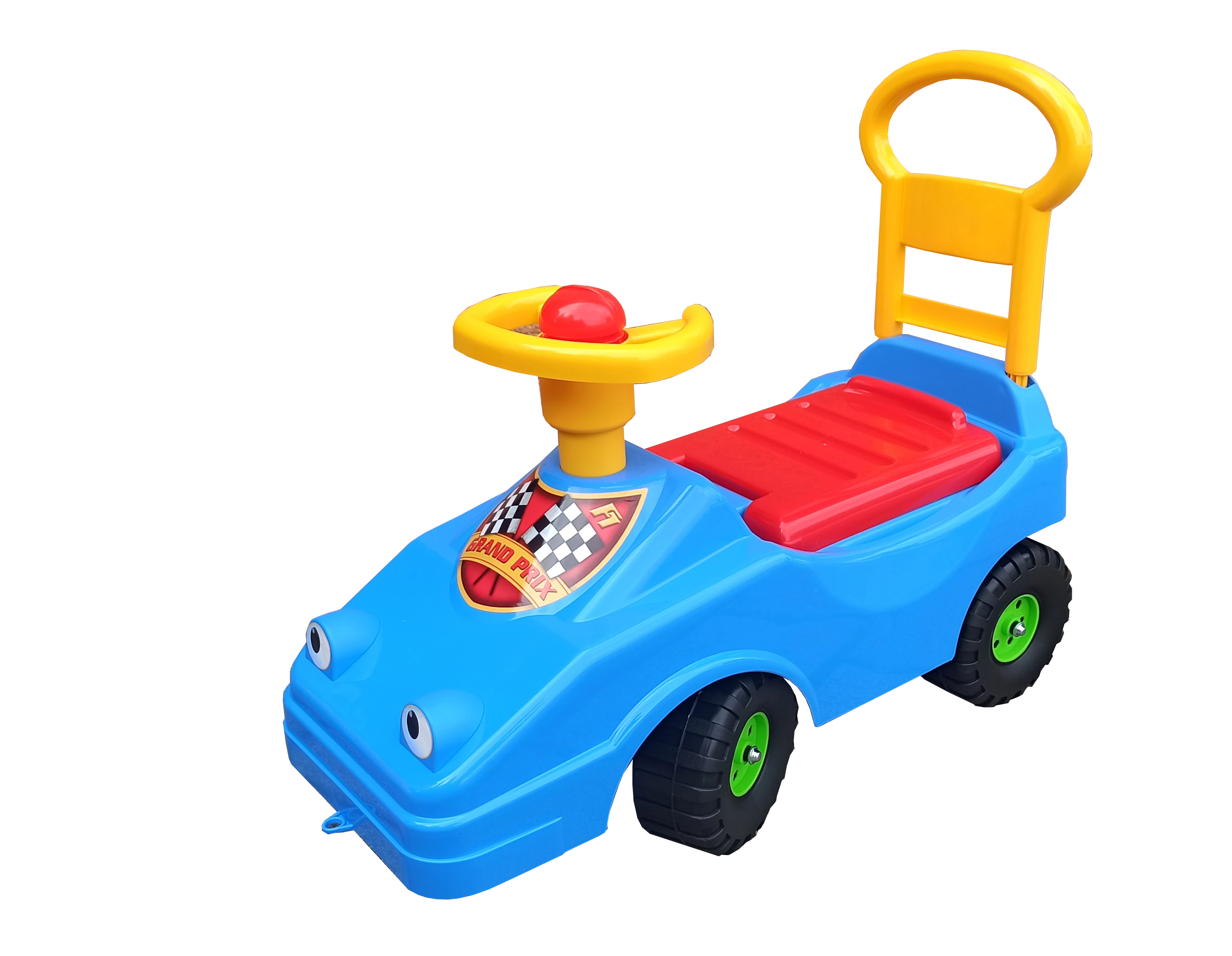 Играчка кола за яздене с пластмасови колела, задвижвана с крака. Управляема, с отваряща се седалка и клаксон. Цвят: син. Размер: 57×24×45 см. Препоръчителна възраст: 1-3 години. Унгарски продукт!