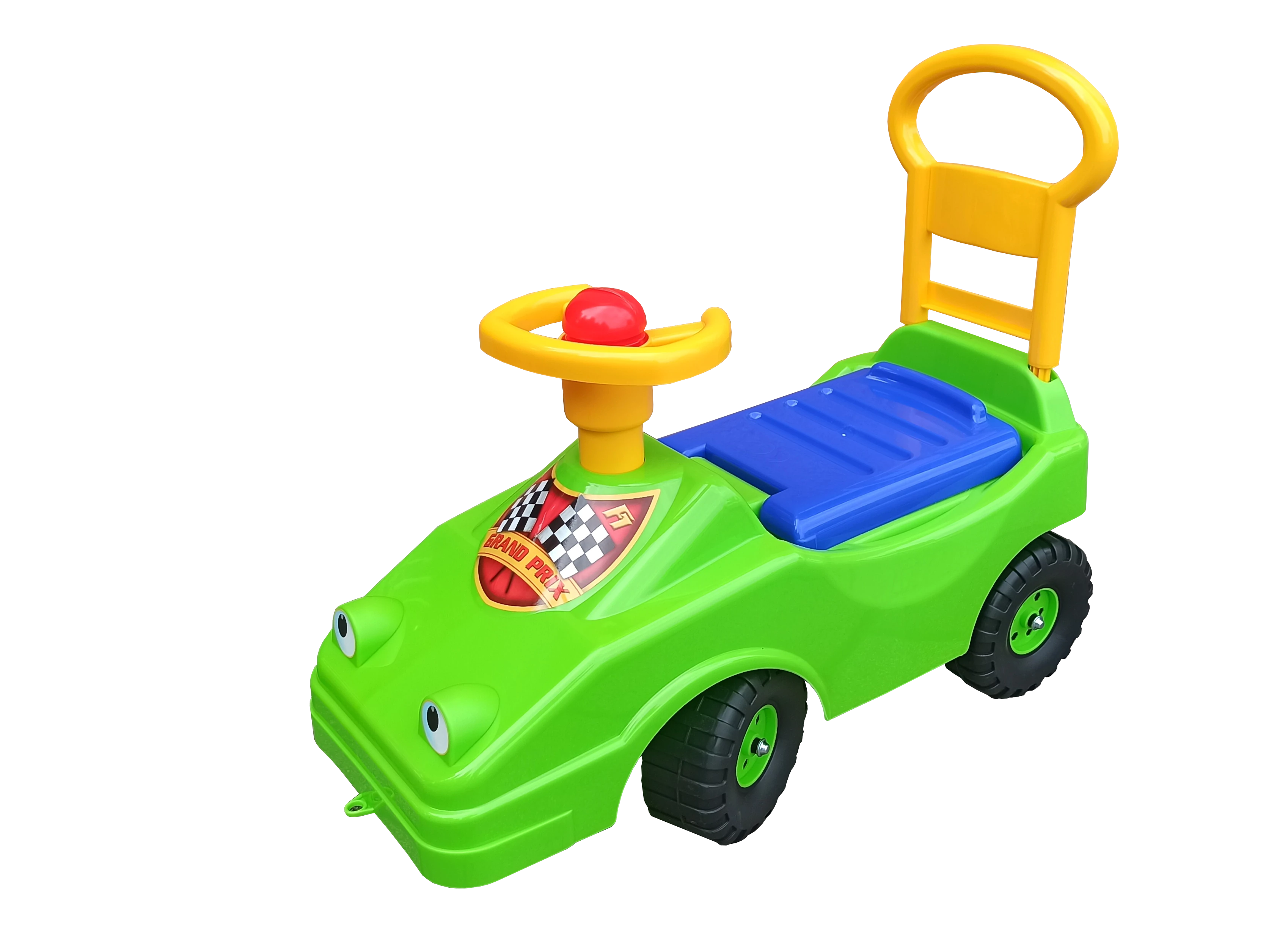 Пластмасова играчка кола за сядане, с пластмасови колела, за задвижване с крачета. Управлява се, със седалка, която се отваря, и с клаксон. Цвят: зелен. Размер: 57×24×45 cm. Препоръчителна възраст: 1-3 години. Унгарски продукт!