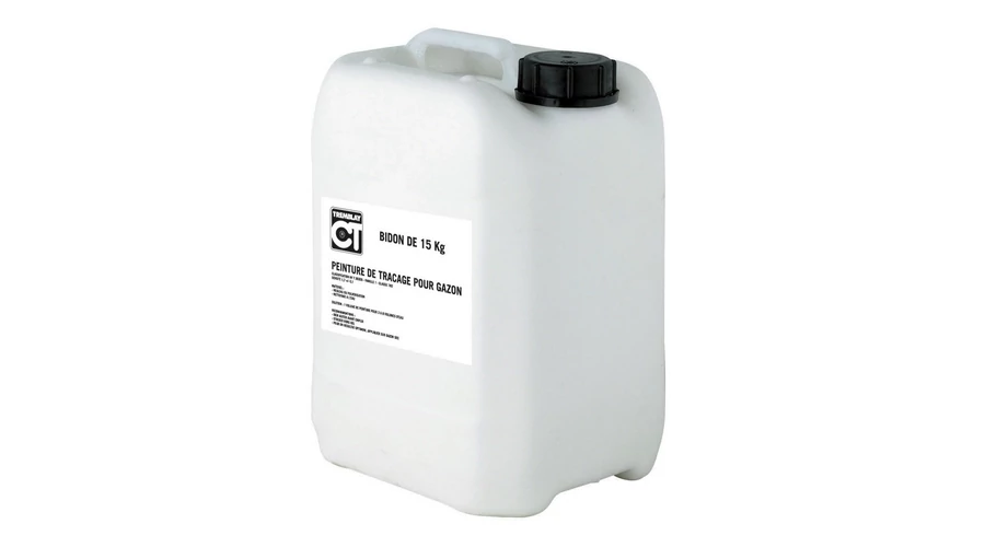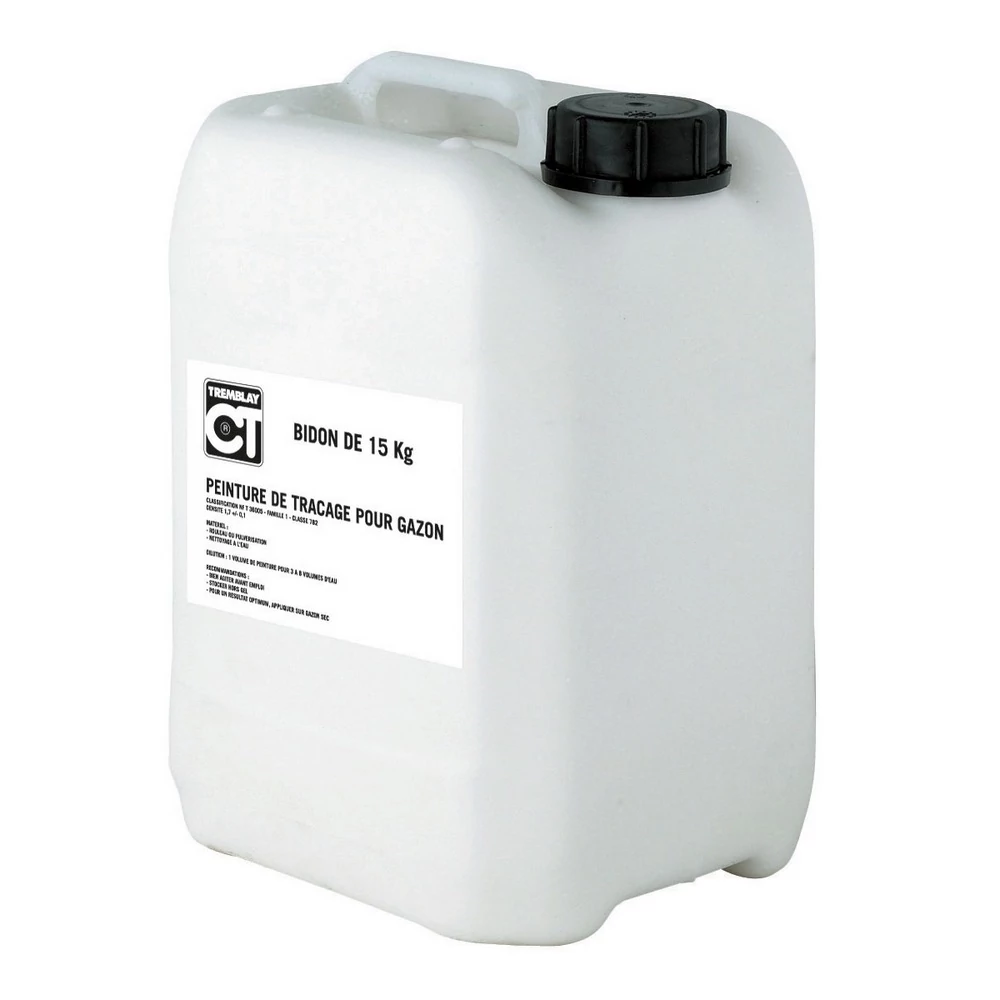 Бяла боя за количка за маркиране на линии за игрище тип Tremblay. 15 литра. Маркиращата боя е подходяща за течни маркиращи устройства. Екологично безвредна за хора, животни и околната среда, биоразградима. Над 5°C изсъхва бързо, устойчива е на дъжд, издържа около четири седмици и има силен блясък. Бяла, съдържание: 15 kg. Разтворима във вода. Съотношение на смесване: при ново маркиране: 1:6, при повторно маркиране: 1:7-8.