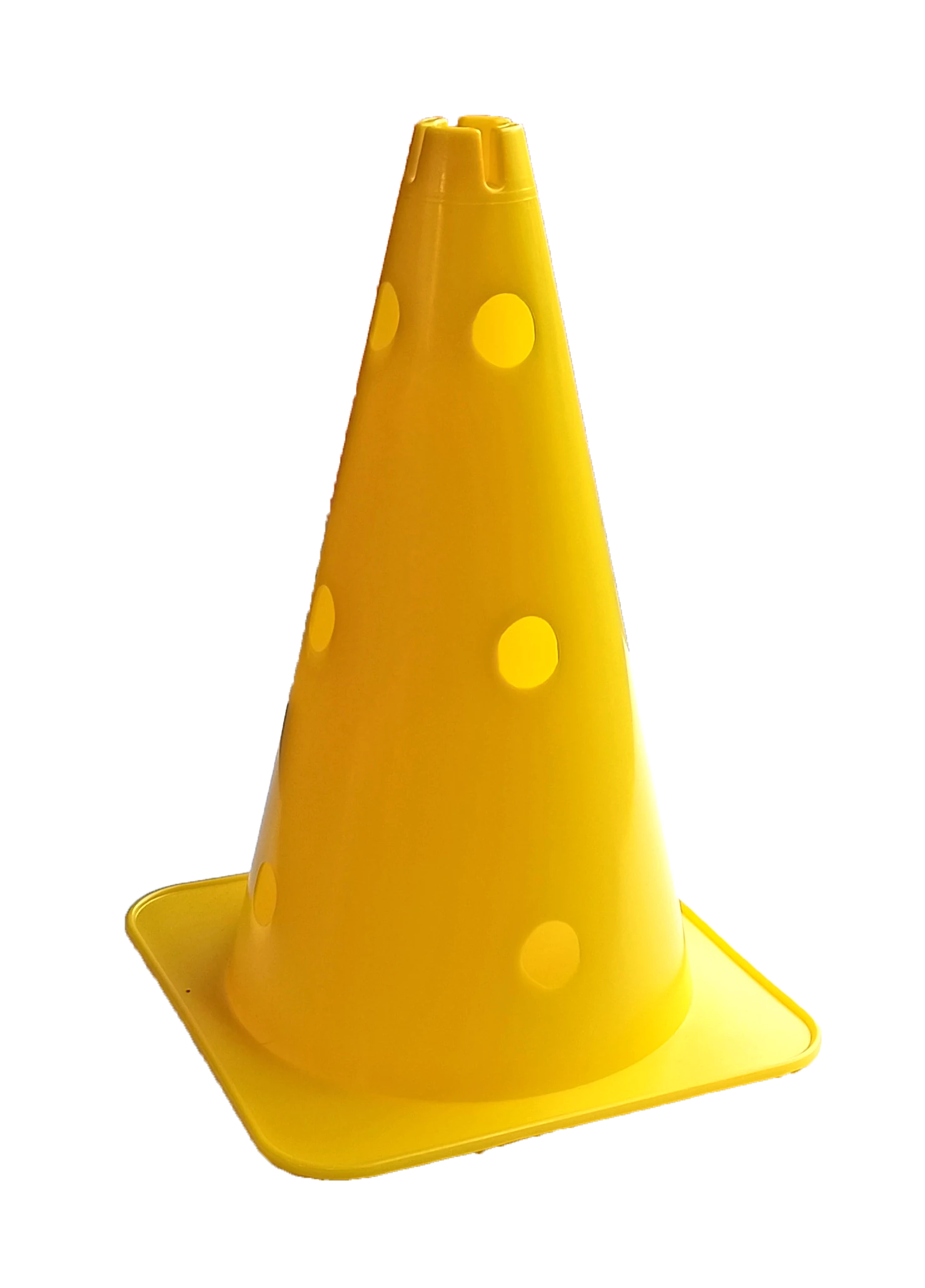 Конусът има изключително широко приложение, тъй като може да се използва от игри с топка до скейтборд и тротинетка. Благодарение на материала си се почиства лесно, изработен е от издръжлива пластмаса. Благодарение на размера и цвета си е добре видим и отдалеч. Препоръчваме го за спортни клубове, училища, частни лица и индивидуални тренировки. Може да се използва за тренировки на открито или закрито, самостоятелно или заедно с други аксесоари (допълнителни конуси, тактически пръти, плоски обръчи, тактически щипки и др.). Изработен е от качествена пластмаса, издръжлив. Височина: 38 см, широка основа (26×26 см), с 4x3 отвора. Цената е за 1 бр. конус! В жълт цвят.