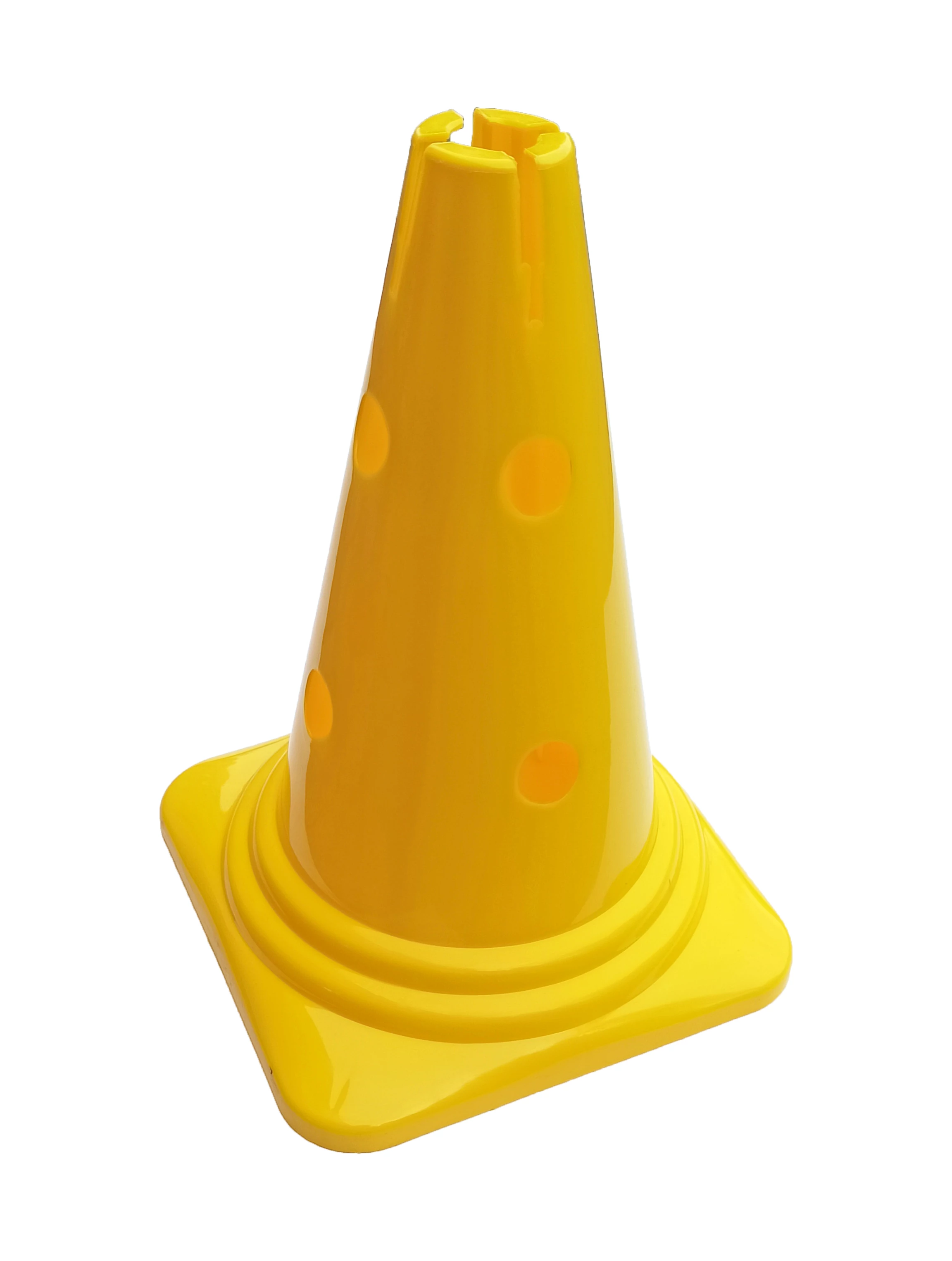 Конусът има изключително широко приложение, тъй като може да се използва от игри с топка до скейтборд и тротинетка. Благодарение на материала си се почиства лесно и е изработен от издръжлива пластмаса. Благодарение на размера и цвета си е добре видим и отдалеч. Препоръчваме го на спортни клубове, училища, частни лица и за индивидуални тренировки. Подходящ е за тренировки на открито или на закрито, може да се използва самостоятелно или заедно с други аксесоари (допълнителни конуси, тактически пръти, плоски халки, тактически щипки и др.). Изработен е от качествена пластмаса, издръжлив. Височина: 30 см, долен диаметър: 22 см, с 4x2 отвора. Цената е за 1 бр. конус! Предлага се в жълт цвят.