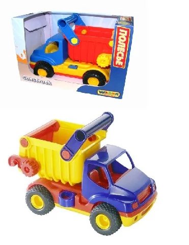 Двумостов самосвал с подвижна накланяща се каросерия, от здрав пластмасов материал, с истински гумени колела. Каросерията може да се накланя чрез изтегляне на щифт, а след връщане в изходно положение може да се фиксира. Размер на опаковката: 295×165×200 mm. Препоръчва се за деца от 2-годишна възраст! Възможни са разлики в цвета. Цената се отнася за 1 бр. Качество WADER!