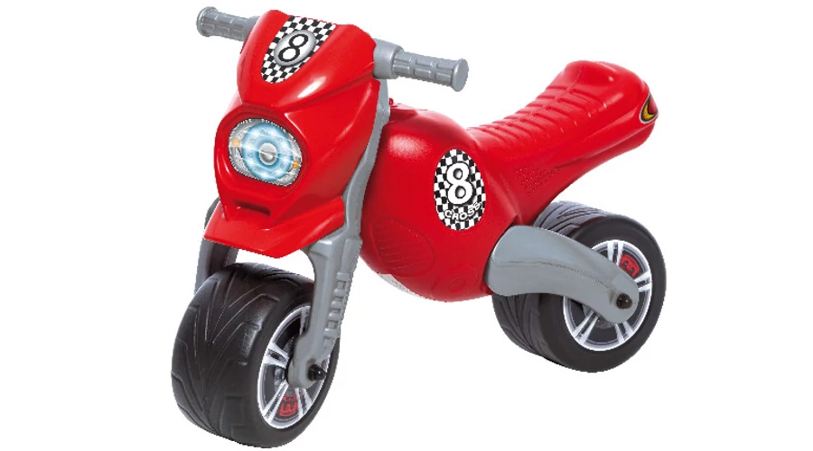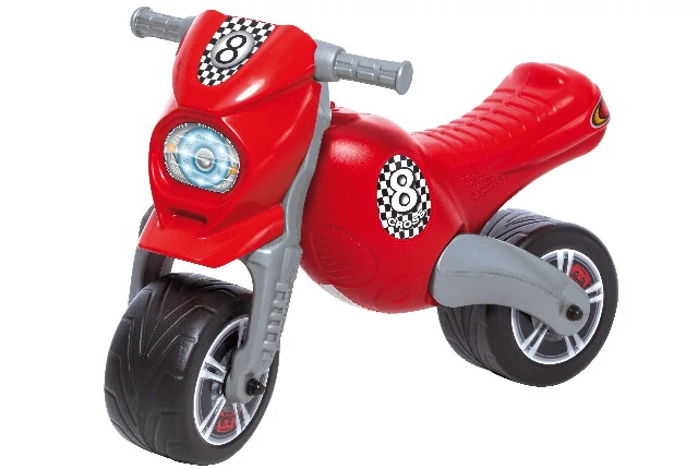 Червен, здрав пластмасов крос мотор, задвижван с крака, с 2 колела. Препоръчва се за деца от 3–4 години. Размер: 39x80x54 cm, височина на седалката: около 36 cm. Стикерите на продукта може да се различават от тези на снимката!