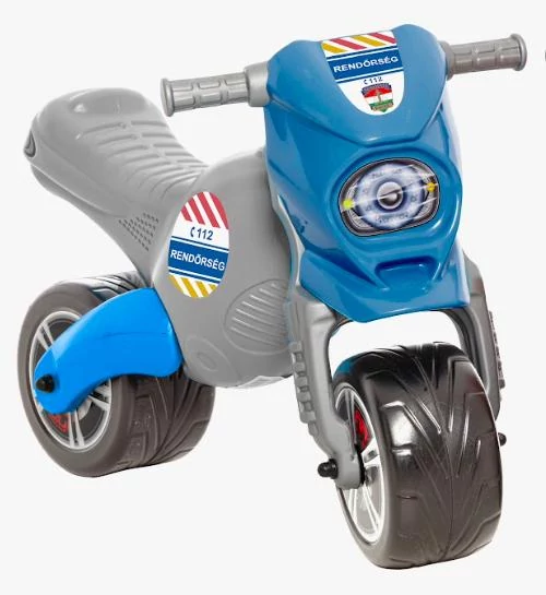 Крос мотор с полицейски мотив, от здрава пластмаса, за задвижване с крака, с 2 колела. Препоръчва се за деца от 3–4 години. Размер: 39x80x54 см, височина на седалката: около 36 см. Стикерите на продукта може да се различават от тези на снимката!
