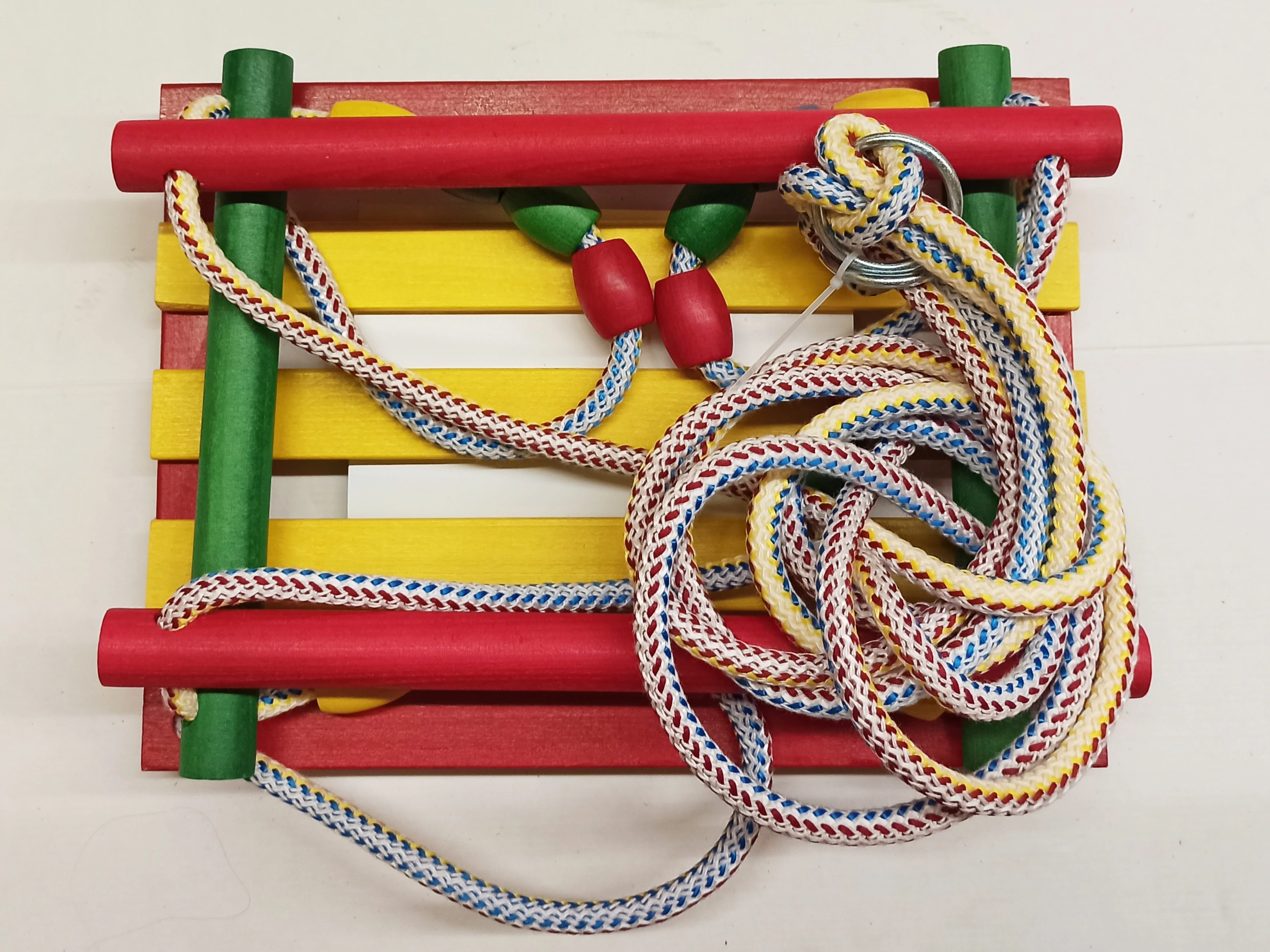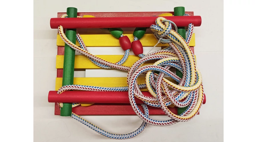 Дървена, безопасна дървена люлка със защитна преграда и здраво въже. Люлката може да се закрепи с метални халки към всякакъв тип кука или карабинер; подходяща е както за употреба на открито, така и на закрито. Закрепването трябва да се завие в дърво с дебелина минимум 5 см. Максимално натоварване: 40 кг. Размер: 38×28×1,5 см. За възрастова група 2–4 години. Може да се окачи на височина до максимум 2 метра.