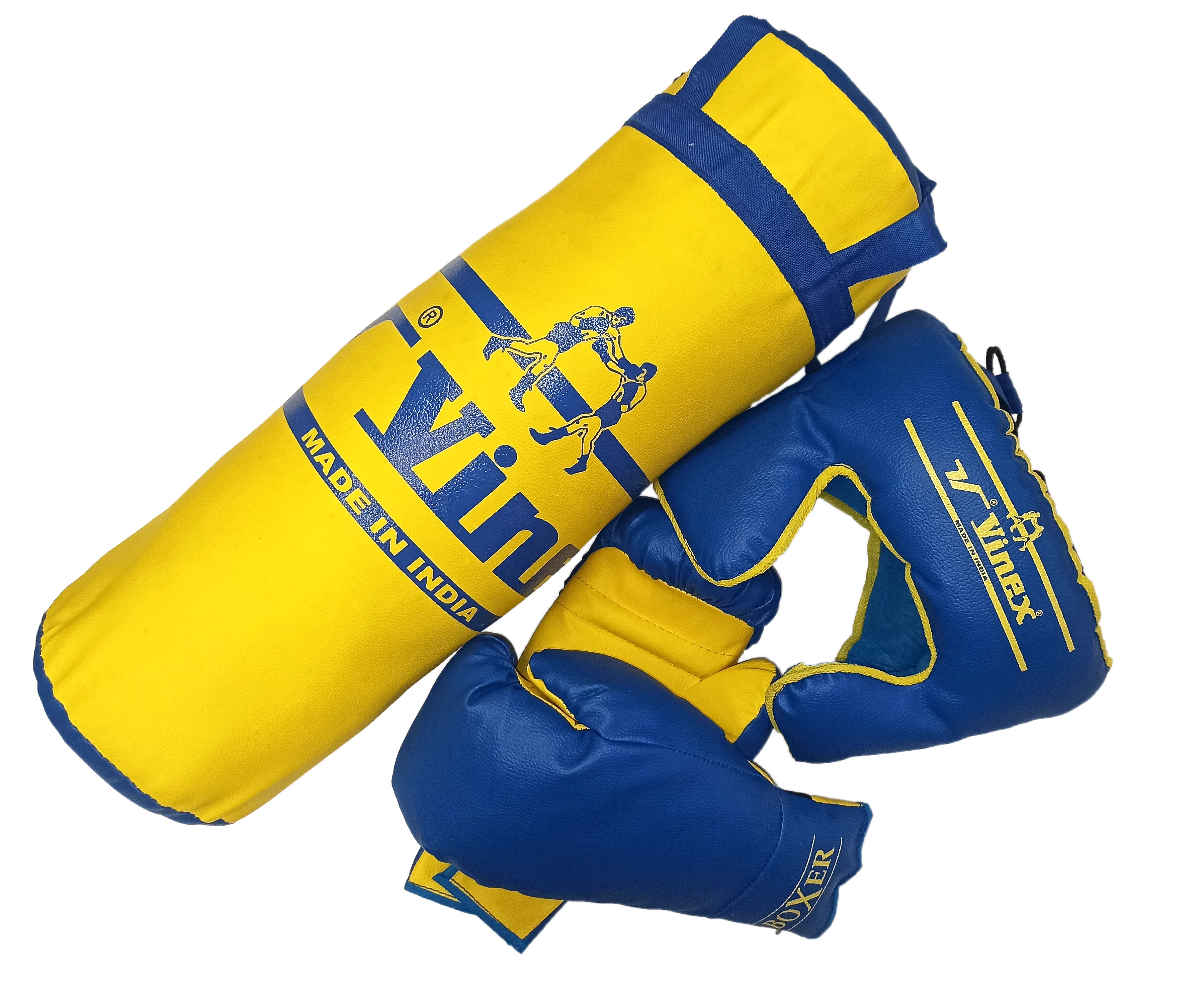 Комплект за бокс от изкуствена кожа, съдържа: 1 бр. боксов чувал от изкуствена кожа с размер около 50×17 см, 1 чифт боксови ръкавици от изкуствена кожа в размер 8 унции и 1 бр. универсална детска предпазна каска. Качество Vinex!