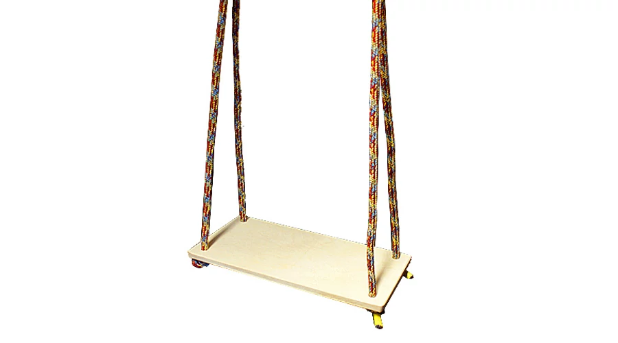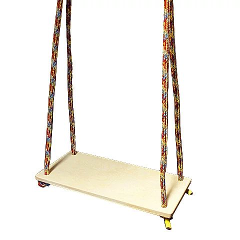 Дървена плоска люлка, подходяща за използване както на открито, така и на закрито, снабдена с въже и метални халки. Размер (седалка): 37×20 см. Максимална товароносимост: 40 кг.