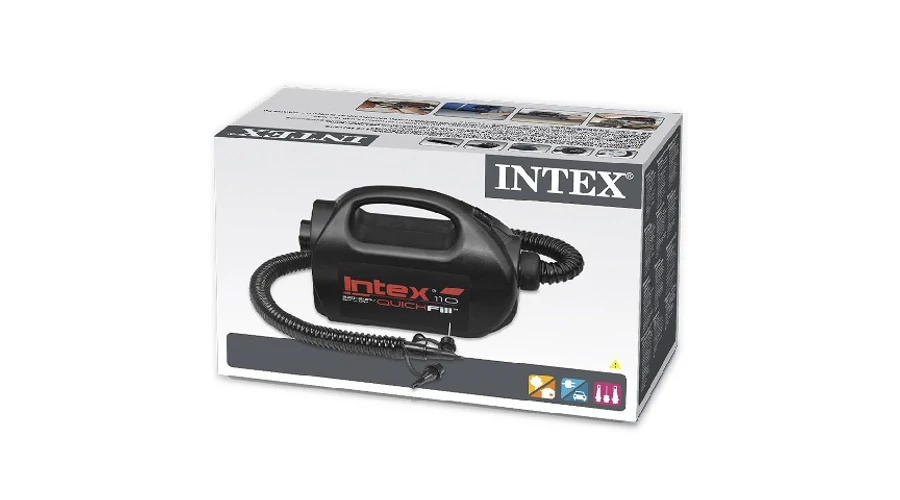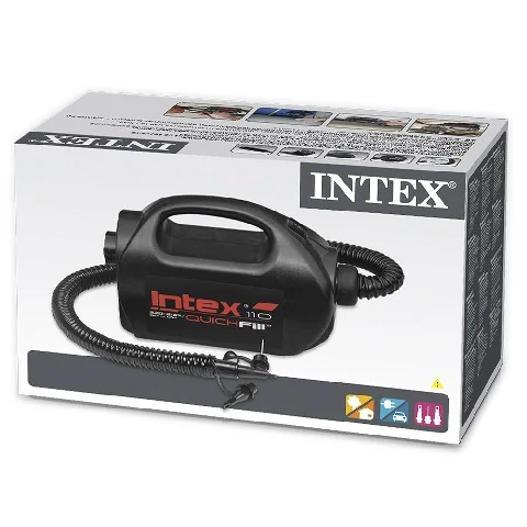 Продуктът може да се захранва както от запалката на автомобила, така и директно от електрическата мрежа. Подходящ е за използване и с надуваеми продукти с различни входове. Преносима помпа за надуване и изпускане. Производителност: 400 литра/минута. Аксесоари: адаптер за запалка, въздушен маркуч с резбован край, три вида адаптери, иглен вентил. Размери: 27×16×15 см. Тегло: 7,5 кг. Многостранни възможности за употреба: плаж, къмпинг, училища, клубове и др. ЗАБРАНЕНО е сезонните плажни артикули да се надуват с домашен компресор! Компресорът може да вкара масло заедно с въздуха в продукта и то да разтвори материала на басейна или дюшека. По-късно материалът може да изтънее! За тази цел INTEX разработи серията електрически помпи.