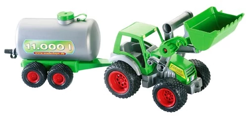 Фермерски трактор с метални оси с ремарке и цистерна, изработен от качествени материали, с истински гумени колела, подходящ дори за институционална употреба. Повдигащ се преден товарач, откачащо се двуосно ремарке-цистерна. Размер на опаковката: 570×165×200 mm. Препоръчва се за деца над 24 месеца! Качество WADER!