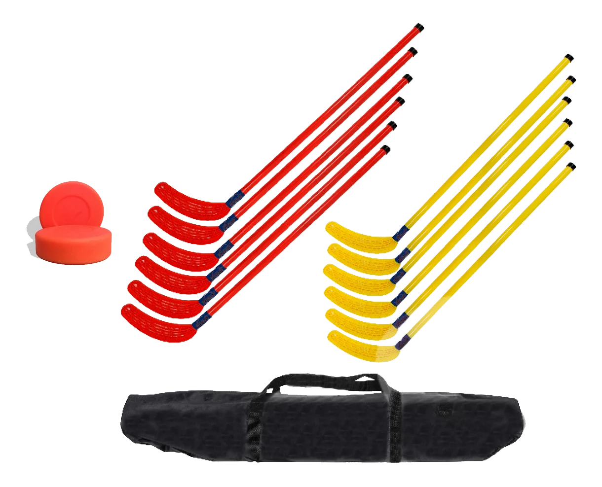 Пълният комплект за 2 отбора съдържа 6+6 броя стикове (в жълт и червен цвят), 2 броя шайби, както и практична торба за пренасяне.