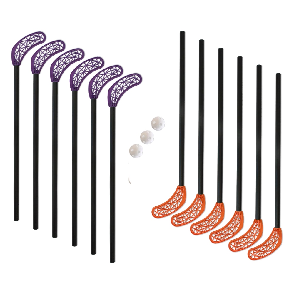 Комплектът за два отбора съдържа 6+6 броя стикове (в лилав и оранжев цвят), както и 3 броя топки (6-те топки на снимката са само за илюстрация!).