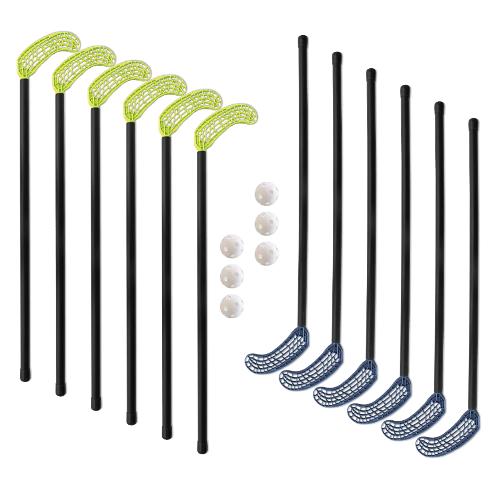 Пълният комплект за 2 отбора включва 6+6 броя стикове (в зелен и син цвят), както и 6 броя топки.