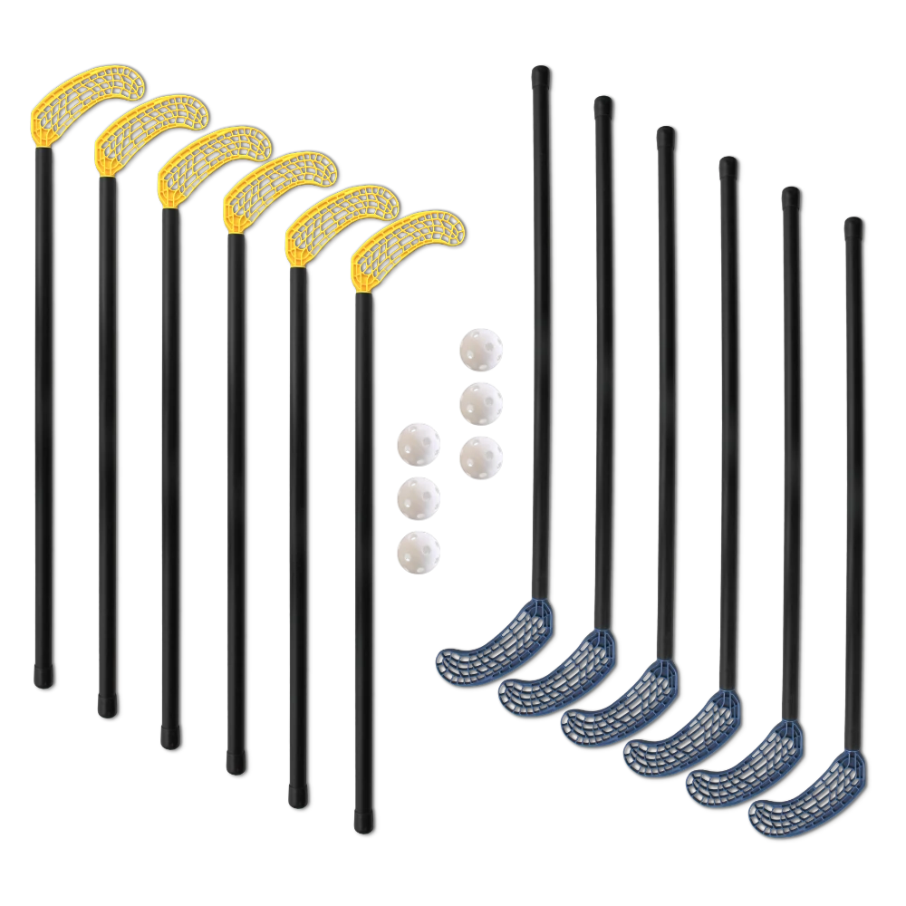 Комплект за флорбол с 95 см карбоново-пластмасова дръжка, със средно разположени глави, подходящи както за десничари, така и за левичари. Общата дължина на стика е 107 см. Подходящ за училищна употреба, за използване на закрито.