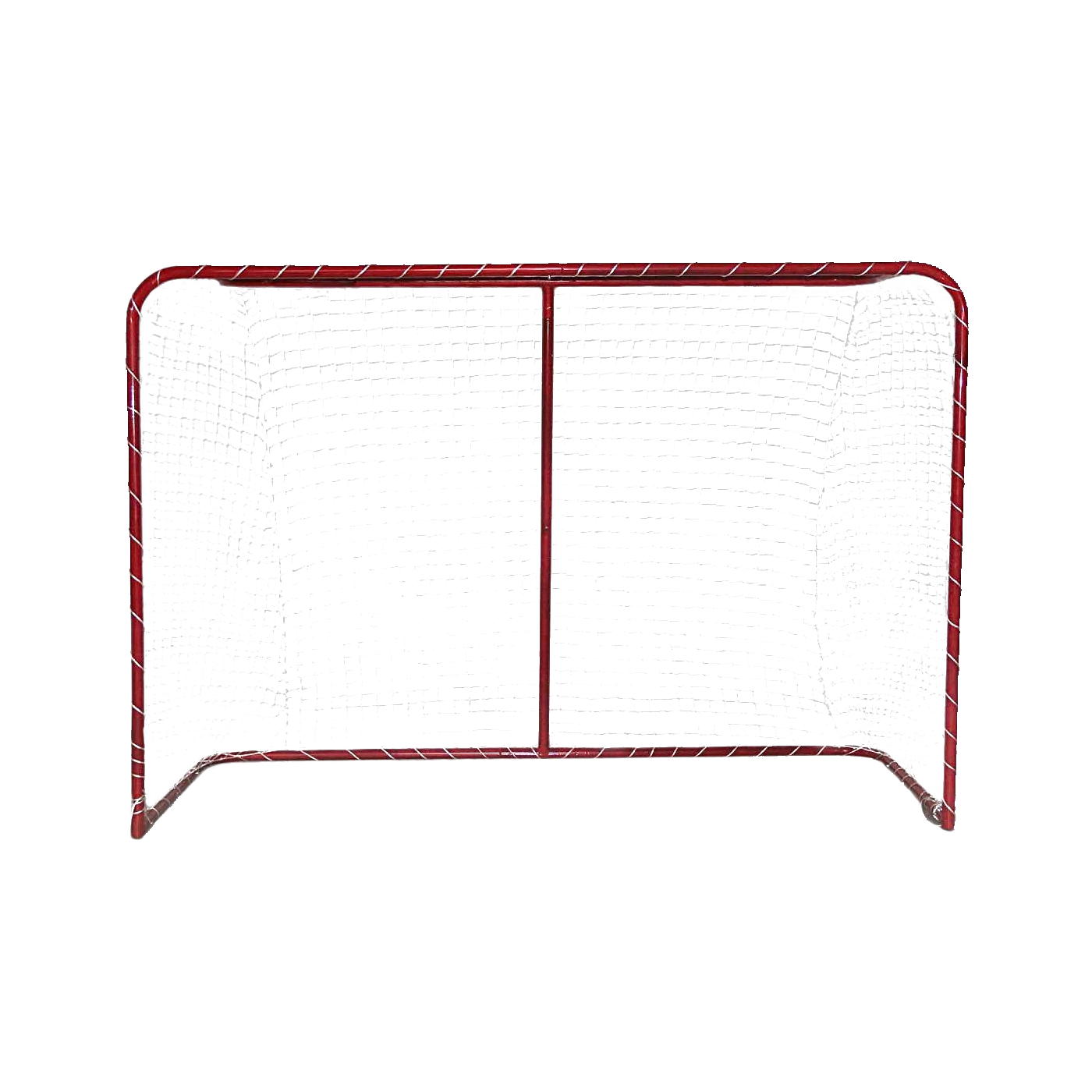Червена, метална фреймова floorball врата със състезателни размери 160x110x65/34 см, с мрежа, във вариант с обтегач на мрежата. Теглото на вратата е 4 кг.