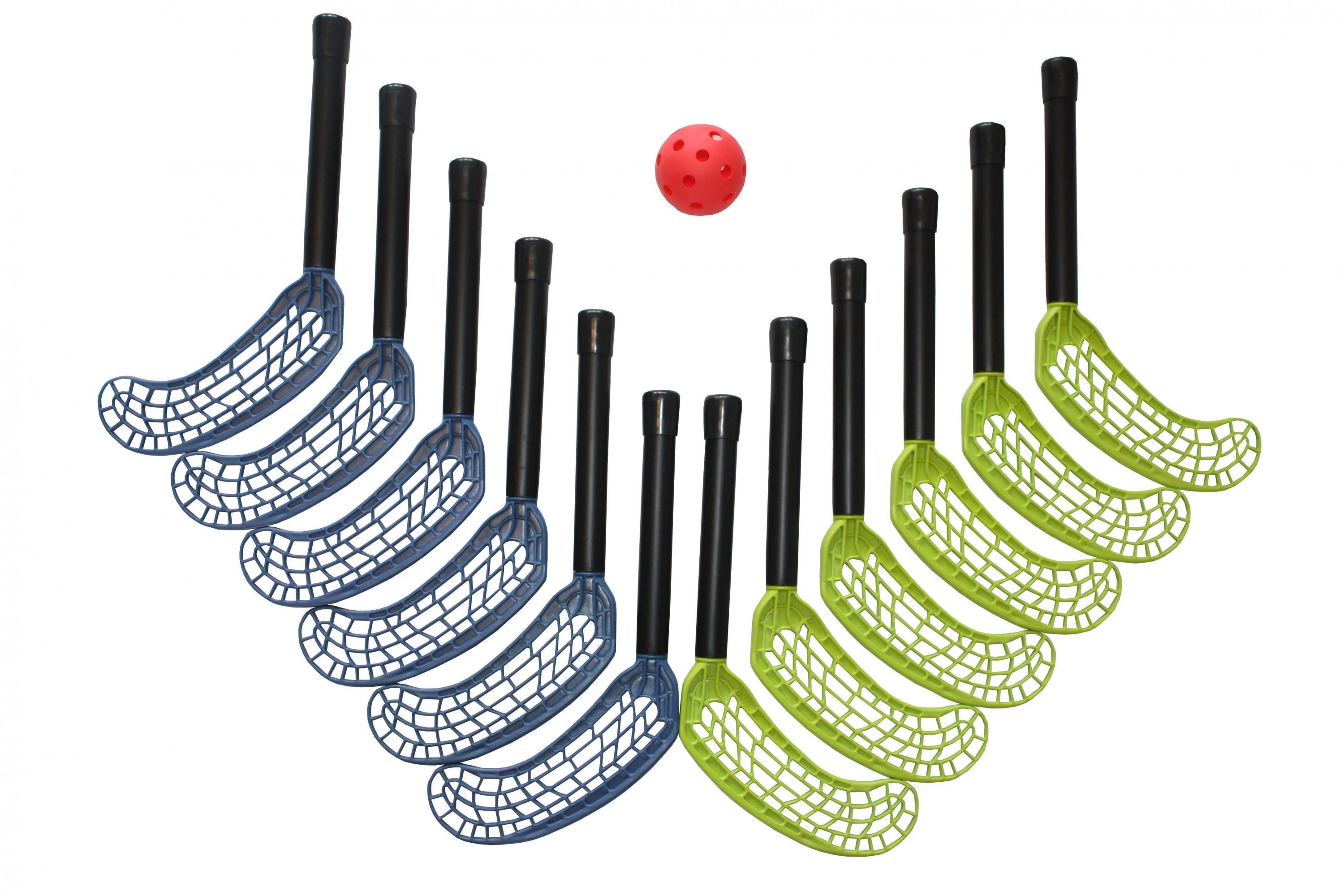 Комплект за флорбол с 20 см пластмасова дръжка, с глави в средна позиция, подходящи както за десничари, така и за левичари. Подходящ и за употреба в детска градина, с ролкови дъски, за употреба на закрито.