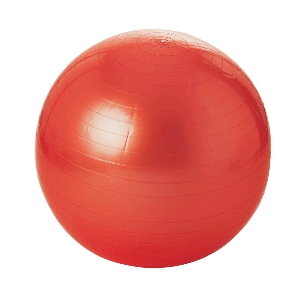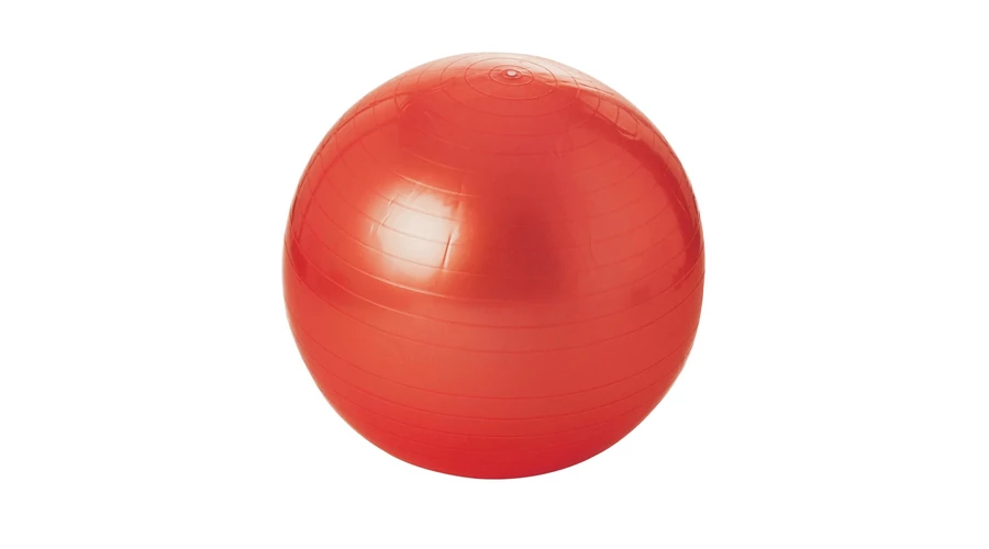 Гимнастическа топка, устойчива на спукване, в червен цвят. Макс. натоварване: 300 кг.