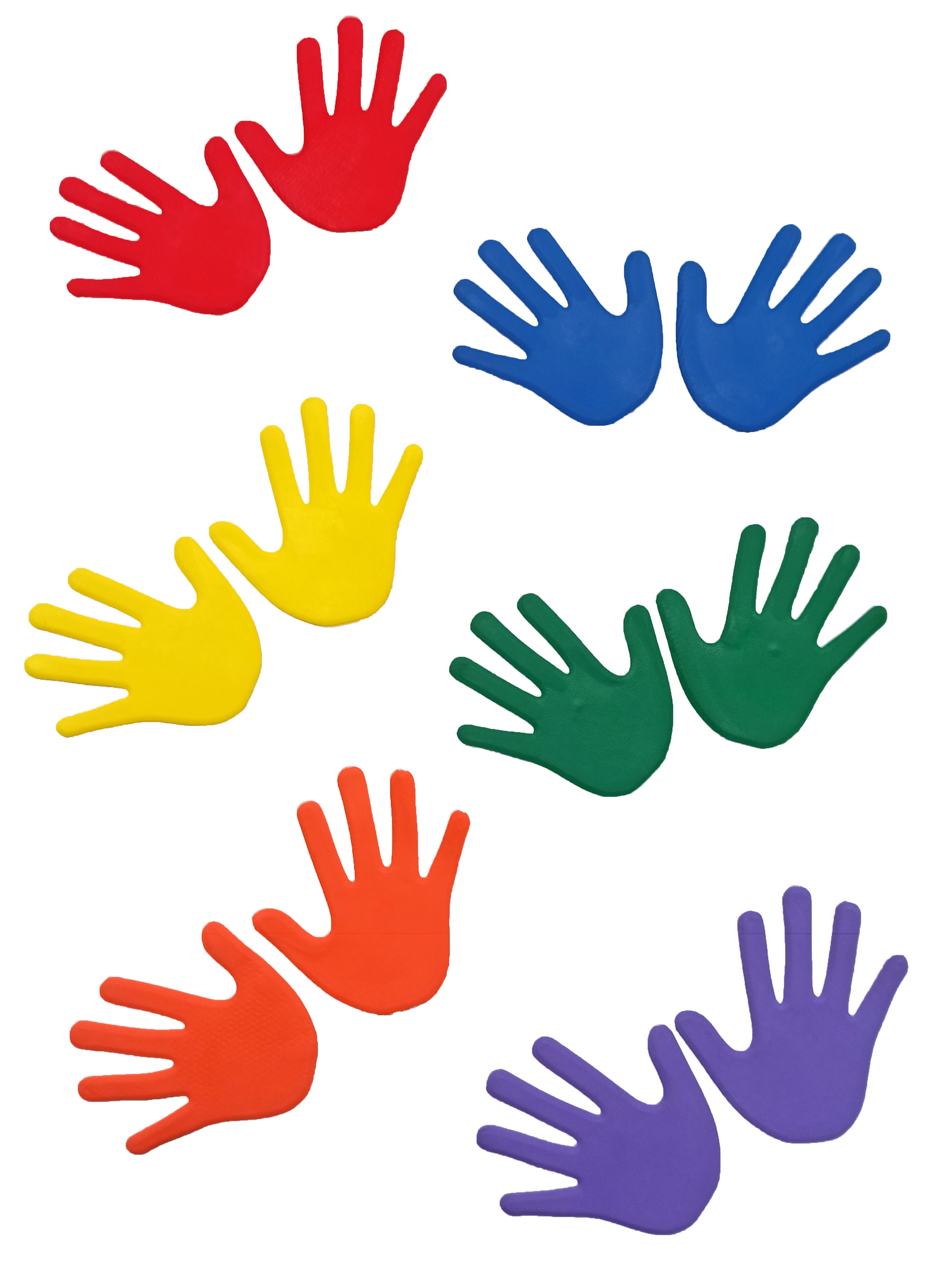 Цветен комплект гумени подови маркери във форма на ръка за игрово развитие на баланса, координацията и осъзнаването на тялото. Идеален за детски градини, училища, детска гимнастика и за изграждане на препятствени трасета и маршрути „ръце–крака“.