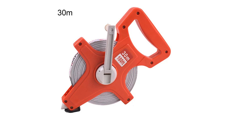 Пластмасова, с отворен корпус, навиваща се, фибростъклена измервателна лента. Обхват на измерване: 30 m.
