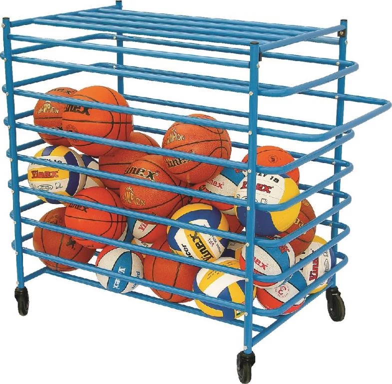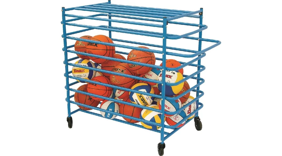 Прахово боядисана метална количка за съхранение на топки с размери 110×60×95 cm, с висока товароносимост. Подходяща за съхранение на около 20 топки. Основни характеристики: заключваща се и с колела. Тегло: около 25 kg. Възможно е разминаване в цвета! Доставя се в разглобен вид, лесна за сглобяване.