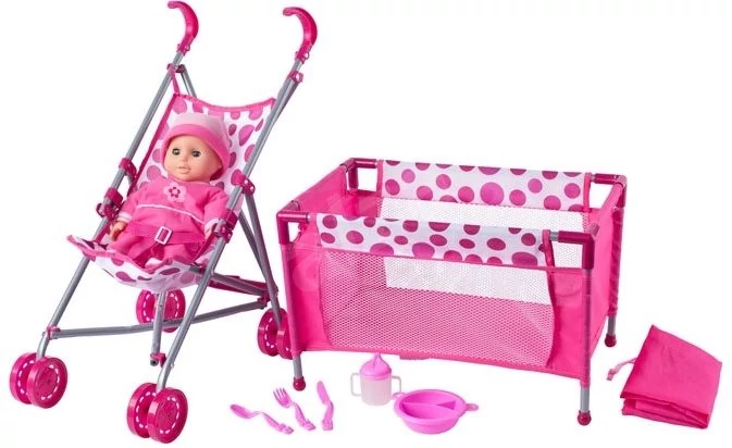 Твоето дете също ли постоянно иска да Ви помага с бебето? Тогава този комплект детска количка Woody е отличен избор за него. Със сигурност ще му хареса сладката кукла, която може да взема навсякъде със себе си. Куклата може да мига и да издава звук. По време на обяд можете да я нахраните със собствените ѝ прибори, които включват купичка, чашка и прибори за хранене. Детето ще се радва, че може да я храни и да я бута в количката, както и че при посещение някъде може да постави куклата в сгъваемото пътно легло. Пътното легло се доставя в практична чанта, така че е наистина лесно да вземете куклата на почивка. Елементите на комплекта са в розов цвят. Детето ще се занимава чудесно с куклата, а Вие ще разполагате с повече време за Вашето бебе. Основни размери: