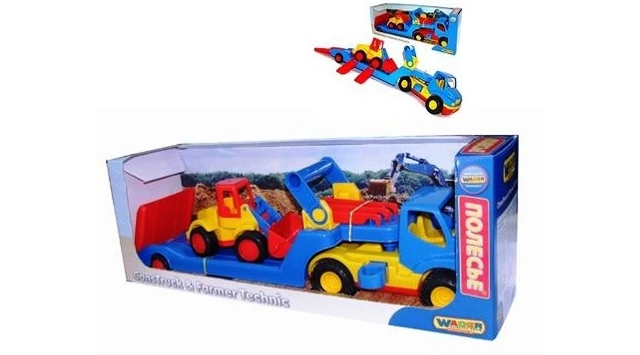 Тримостов автовоз от здравa пластмаса, с истински гумени колела. Ремаркето може да се откачи чрез издърпване на щифт и да се закачи обратно. Включеният аксесоар е двуосен метален багер Basic, показан на снимката. Размер на опаковката: 570× 165×200 mm. Препоръчва се за деца от 2-годишна възраст! Цената е за 1 бр. Качество WADER!