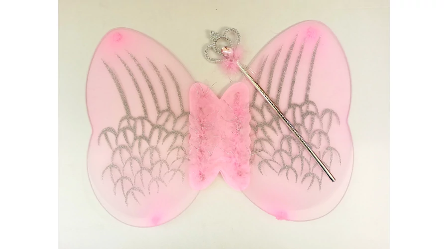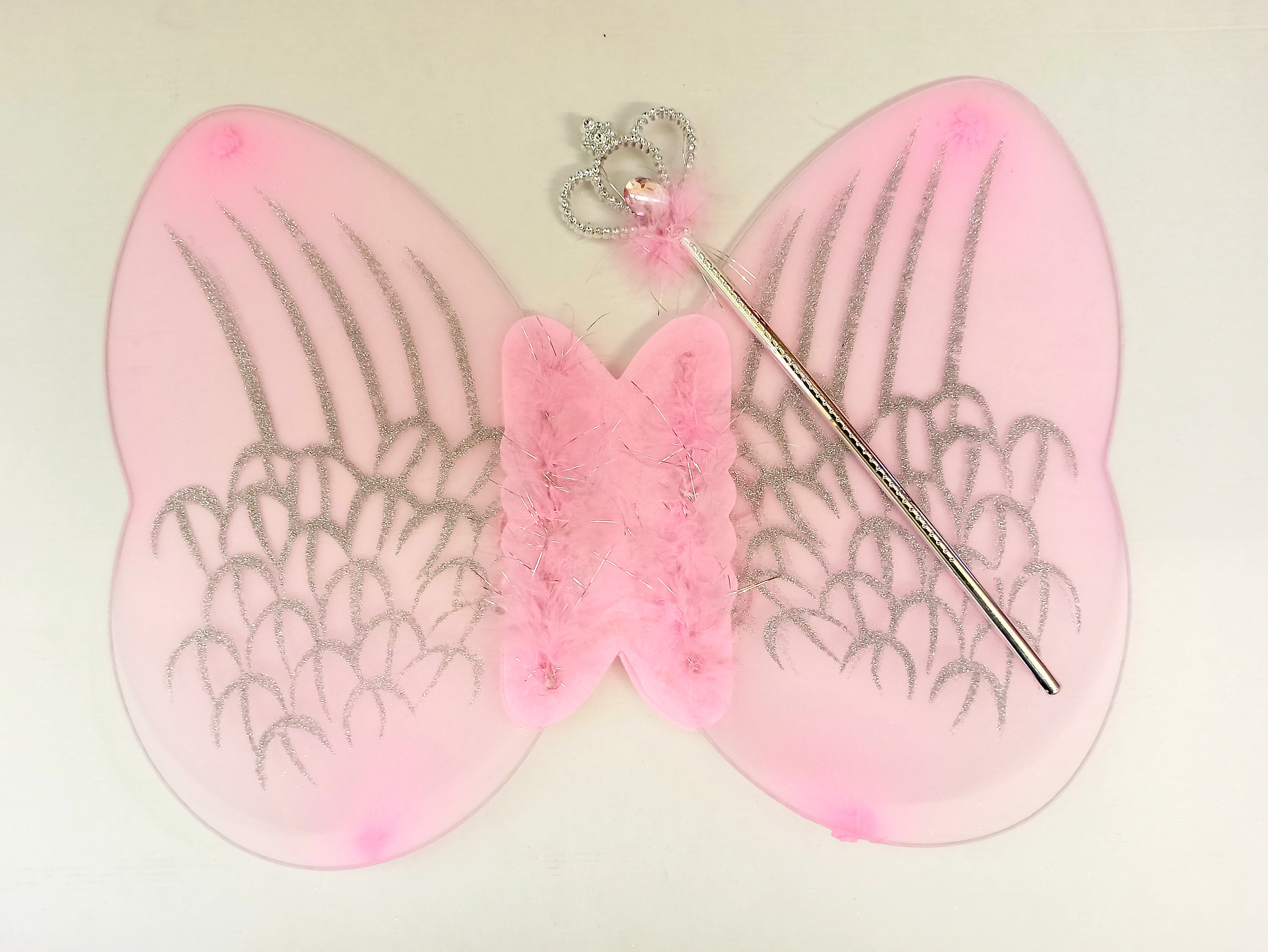 Комплект от две части, в найлонова опаковка. Феерични криле с вълшебна пръчка, които се закрепват на раменете с ластик. Предлага се в два варианта. Размери на крилата: 48,5x36 cm. Препоръчва се за деца над 3 години.