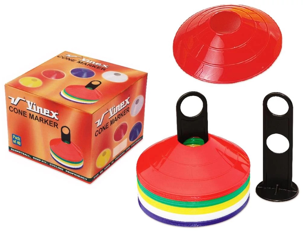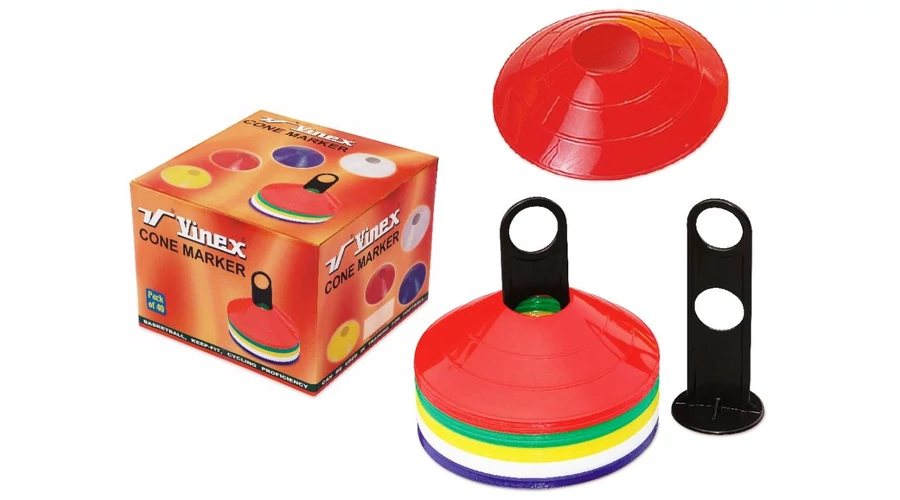 Универсален комплект плоски дискови конуси за тренировки по отборни спортове и маркиране на игрище. Изработени от гъвкав материал, в добре видими цветове, с пластмасов държач.
