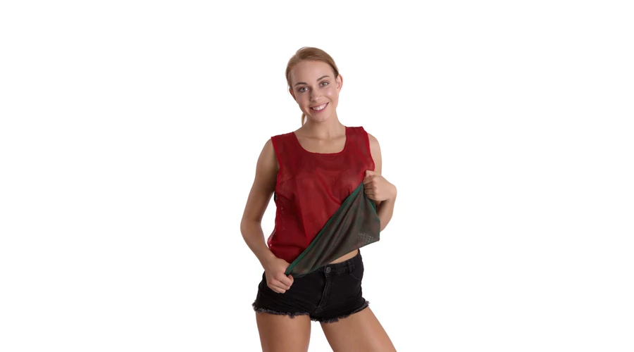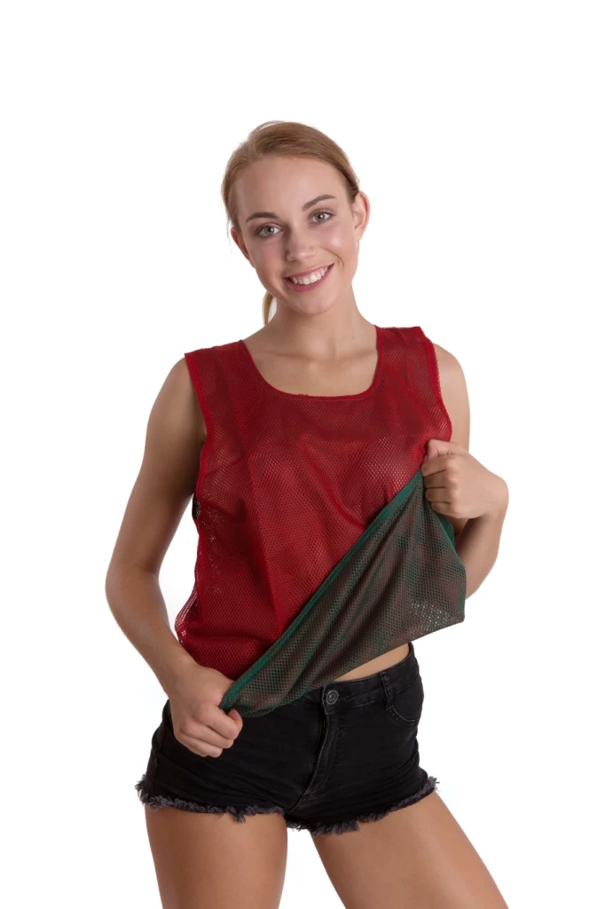 100% полиестер, двустранна (двуцветна: червено-зелена) маркираща жилетка. Размер S: 50×44 см.