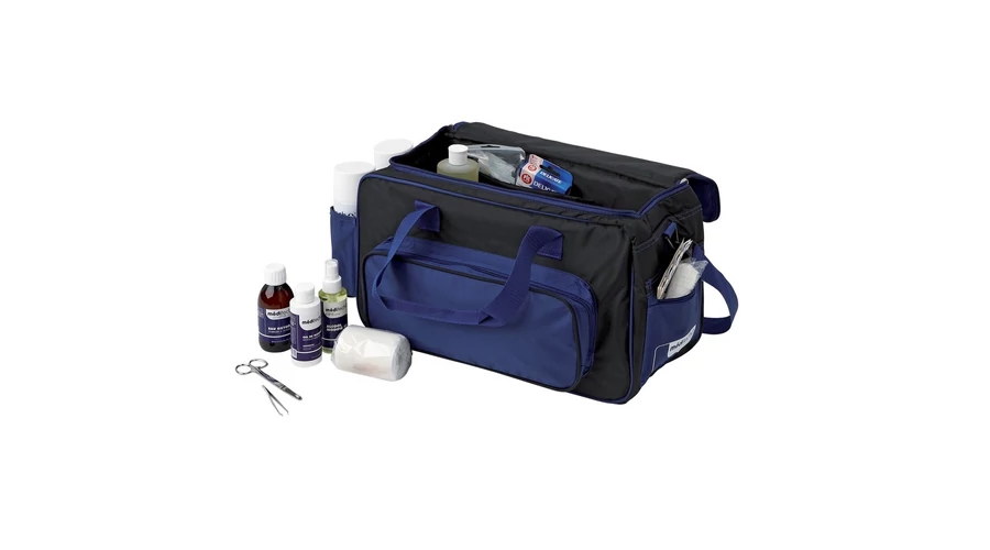 Съдържание на комплекта: 1 медицинска чанта (47×27×24 cm), 1 бр. ножица, 1 бр. медицинска пинсета, 2 чифта ръкавици, 2 пакета студен компрес, 2 бр. охлаждащ спрей, 1 бр. дезинфекциращ спиртен спрей (70%), 1 гел за масаж с арника и ментол, 3 бр. еластичен медицински бинт, 2 пакета марля, 2 ролки медицинска лепенка, 10 бр. спиртни кърпички, 1 кутия с 10 бр. превръзки за притискаща превръзка, 1 бр. самозалепваща повърхностна лепенка с марля, 1 бр. самозалепваща повърхностна лепенка, 5 пакета ленти за приближаване на рани, 4 пакета лепенки за рани, 4 ролки самозалепващ еластичен бинт с различна ширина.