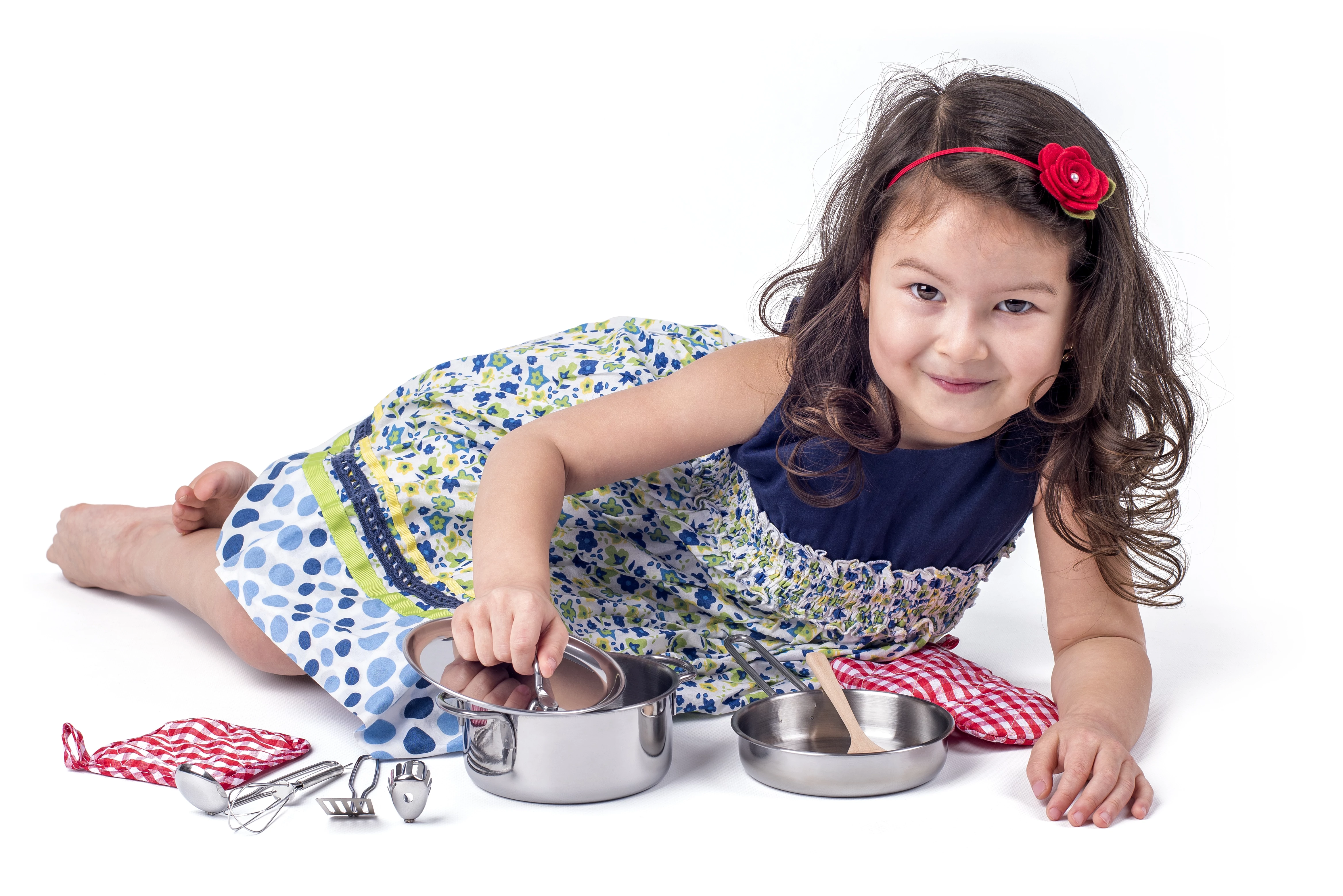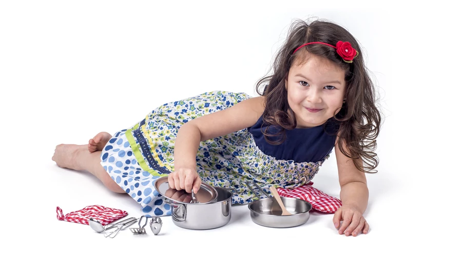 Комплект от 10 части, в мрежеста опаковка. Това е играчка, която не е само за игра, а детето може да се занимава и в кухнята, помагайки на майка си. Съдържание: 1 бр. тенджерка с капак (с диаметър 13 см), 1 бр. тиган, 1 бр. дървена лъжица, 1 бр. телена бъркалка, 1 бр. черпак, 1 бр. лъжица за паста, 1 бр. шпатула за месо, 1 бр. текстилна ръкавица, 1 бр. подложка за тенджера. Препоръчва се за деца над 3 години.