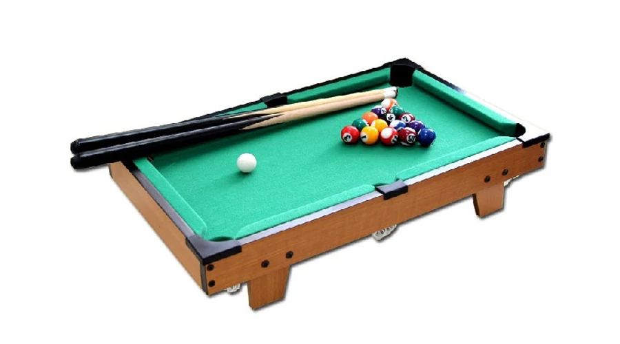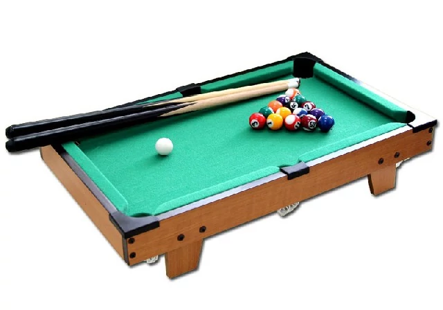 Може да се постави на маса, размер: 67×38×15 см. Комплектът включва: комплект топки, 2 бр. мини щеки, пластмасов триъгълник.