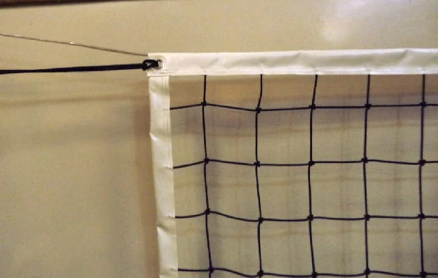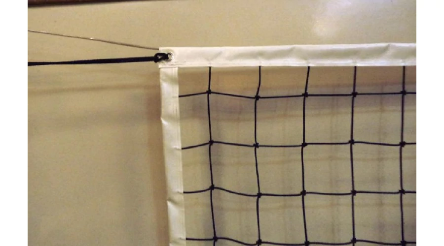 Нормална по размер тренировъчна ръчно плетена волейболна мрежа 9,5×1 m, подходяща както за употреба на открито, така и на закрито. Плетена от 3 mm черен материал, с бял, 5 cm устойчив на атмосферни влияния кант отгоре и отстрани. С 4 mm стоманено въже с пластмасово покритие, със заключващ фиксатор в края. Унгарски продукт!
