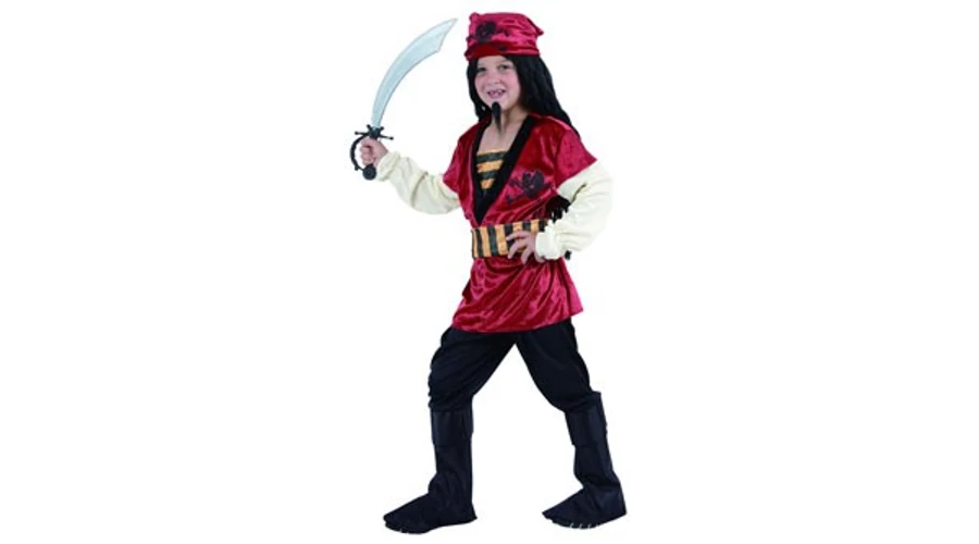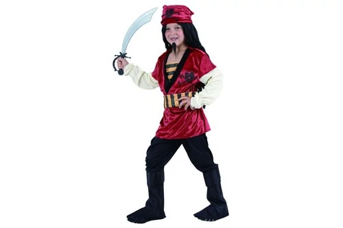 Съдържание на комплекта: 1 бр. горнище с дълъг ръкав, 1 бр. панталон с ластична талия и с покривало за ботуши в долната част, 1 бр. пиратска кърпа за глава, 1 бр. колан. Налични размери за поръчка: S (110-120), M (120-130), L (130-140)