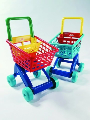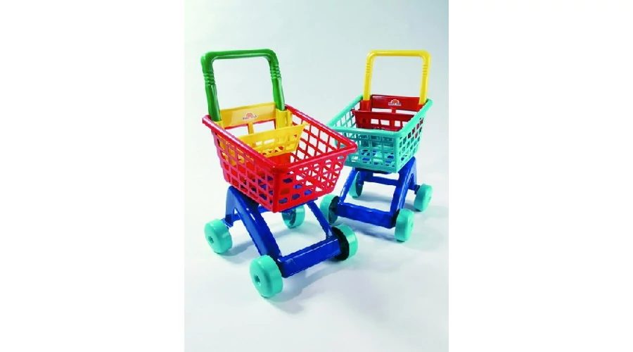Цветна пластмасова пазарска количка за деца, която е идеално допълнение към играта на магазин. Лесно се бута и може да бъде напълнена за миг с играчки и играчки храни.