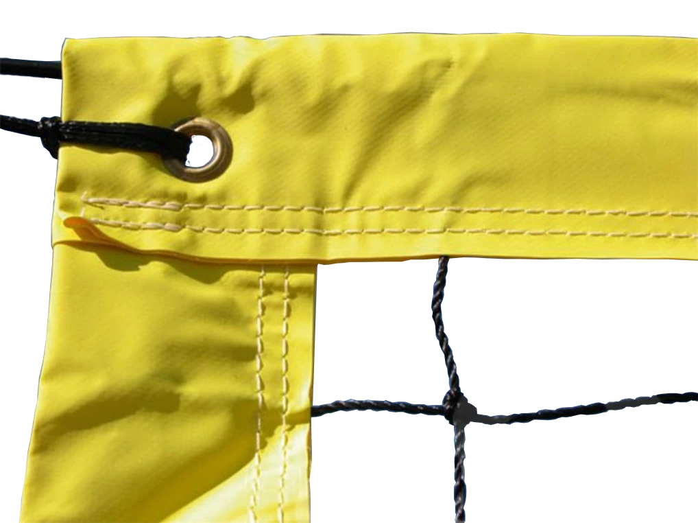 UV-устойчива мрежа за плажен волейбол 9,5 x 1 m, с дебелина на нишката 2,5 mm, с размер на окото 10 cm, в черен цвят. По периферията – 6 cm широк жълт кант от здрава брезентова материя. Продуктът включва 5 mm стоманено въже за опъване.