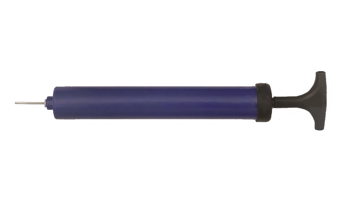 Висококачествена еднопосочна ръчна помпа за топки, в син цвят. Включен е метален иглен накрайник (намира се в дръжката на помпата)! Обща дължина: 30 см.