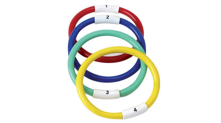 Игра за умения за деца. Трябва да се съберат халките от дъното на басейна. Комплектът съдържа 4 бр. цветни халки. Препоръчителна област на използване: закрит басейн. Не е UV устойчив!