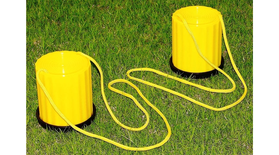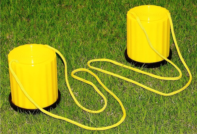 Поради променените височинни и дистанционни условия детето трябва да запазва равновесие и по време на повдигане и изпъване на крака. Изпълнението на по-сложната последователност от движения развива в голяма степен и способността за концентрация и баланс. Материал: подсилена пластмаса, с противоплъзгащ пластмасов кант. Размери: 12 см в диаметър и 13 см височина. Дължина на въжето: 145 см. Предлага се в смесени цветове (червен, жълт, зелен и син). Препоръчва се за деца от 3-годишна възраст! Посочената цена е за 1 чифт!