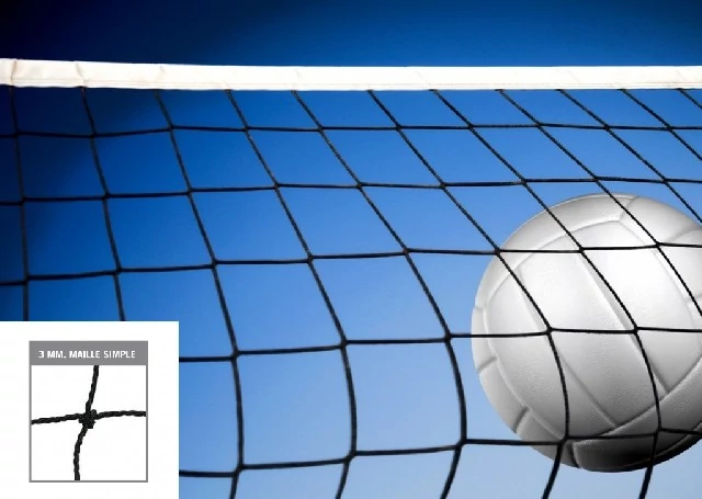 Състезателна мрежа за волейбол 9,5 x 1 м, с дебелина на нишката 3 мм, с размер на окото 10 см, в черен цвят. От здрав брезентов материал с 5 см широк бял горен кант, както и 3,5 см черен страничен и долен кант. Продуктът включва 3 мм стоманено въже за опъване.