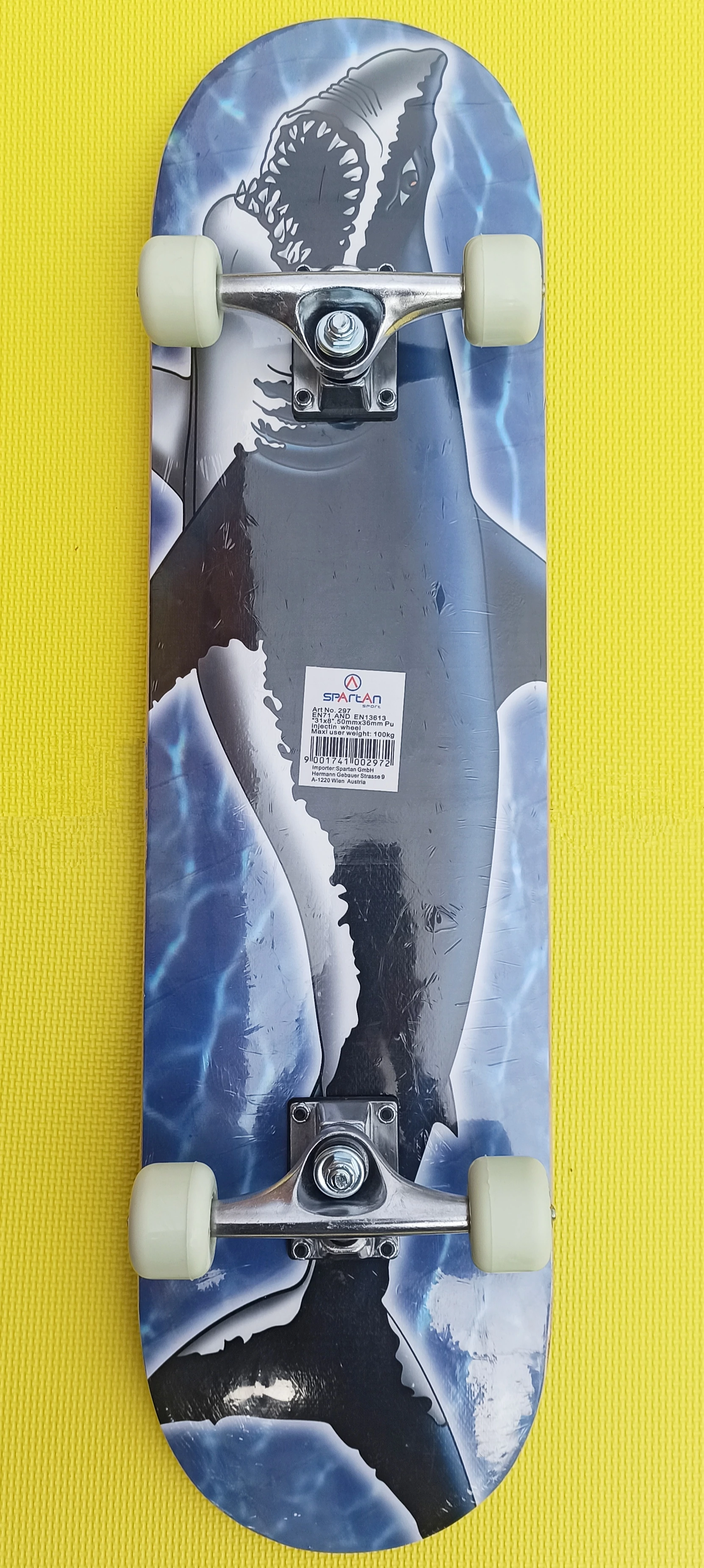Дървена дъска от китайски клен, 11 мм, с двойно вдлъбната форма, нормален размер (79×20 см), колела 50×36 мм 85A PU Injection с лагери (ABEC 3), подсилени алуминиеви оси. Подходяща за телесно тегло до 100 кг.