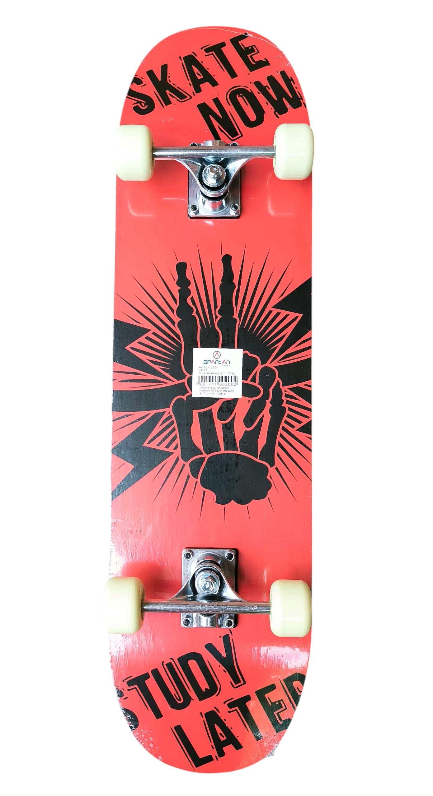 Индонезийска ламинирана дъска с двойно конкавна форма, нормален размер (79×20 см), 50×36 мм PU колела, с лагери (ABEC 1 колела, алуминиеви оси). Скейтборд за начинаещи, не е подходящ за скокове! Подходящ до 50 кг телесно тегло.