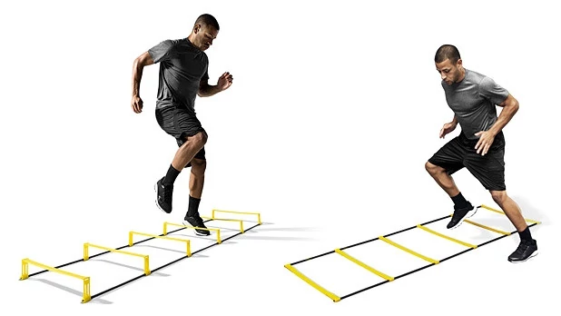 Стълбата с регулируема височина на стъпалата е перфектно допълнение за развиване на координацията на движенията. Може да се използва разгъната или със повдигнати стъпала. Стъпалата, които могат да се повдигнат до височина 10 см, принуждават към по-високо повдигане на коленете, с което значително се повишава ефективността на тренировъчната работа! Дължина на стълбата: 4 м.